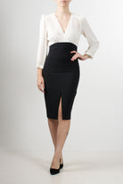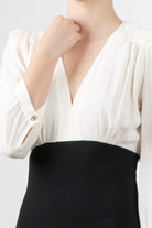 Twinset's midi dress features a sheath silhouette that elegantly accentuates femininity. The design features a lightweight voile bodice with a V-neck, shoulder straps, long sleeves, and a fitted skirt with a front slit. The fitted waistline accentuates the silhouette, while the contrasting color lends a sophisticated elegance, perfect for special occasions or refined office looks.