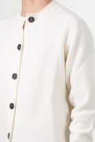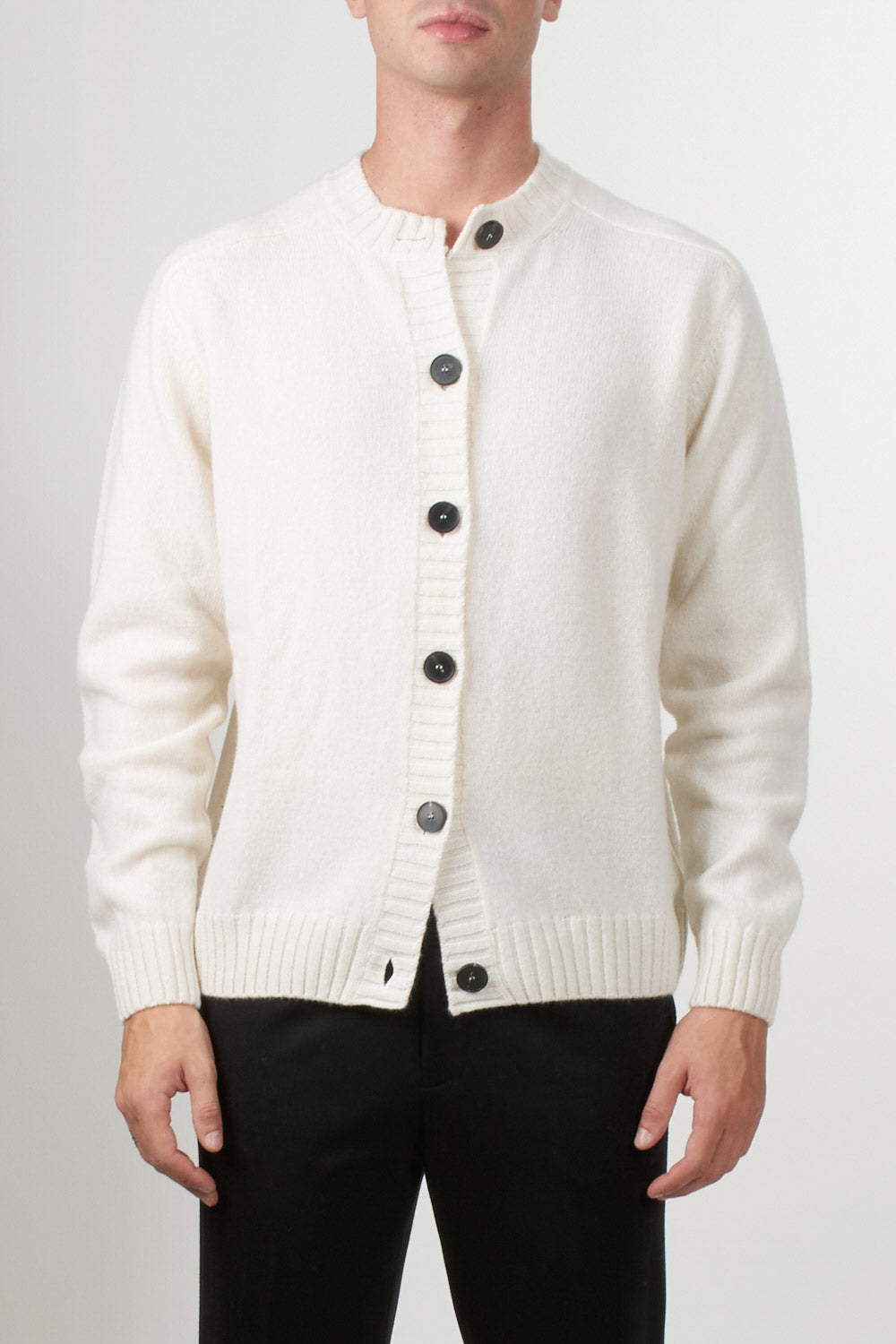 Wool and cashmere cardigan with a round neck and front button closure. Ribbed cuffs and hem ensure a comfortable and structured fit. A men's wardrobe essential.