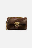 Pinko Love Puff classic shoulder bag made of soft leather and suede, featuring a diagonal band design and the classic gold-tone Love Birds buckle. It features a flap closure with magnetic button, a gold-tone chain shoulder strap, and a lined interior with a single compartment and a zip pocket. Elegant and sophisticated, it's the ideal accessory for any occasion.