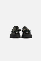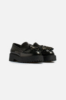 Patent leather loafer with a modern and bold design. The tassel detail and metallic inserts add a sophisticated touch, while the rubber platform sole ensures comfort and stability. A versatile model perfect for everyday or more sophisticated looks.
