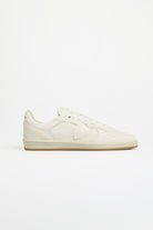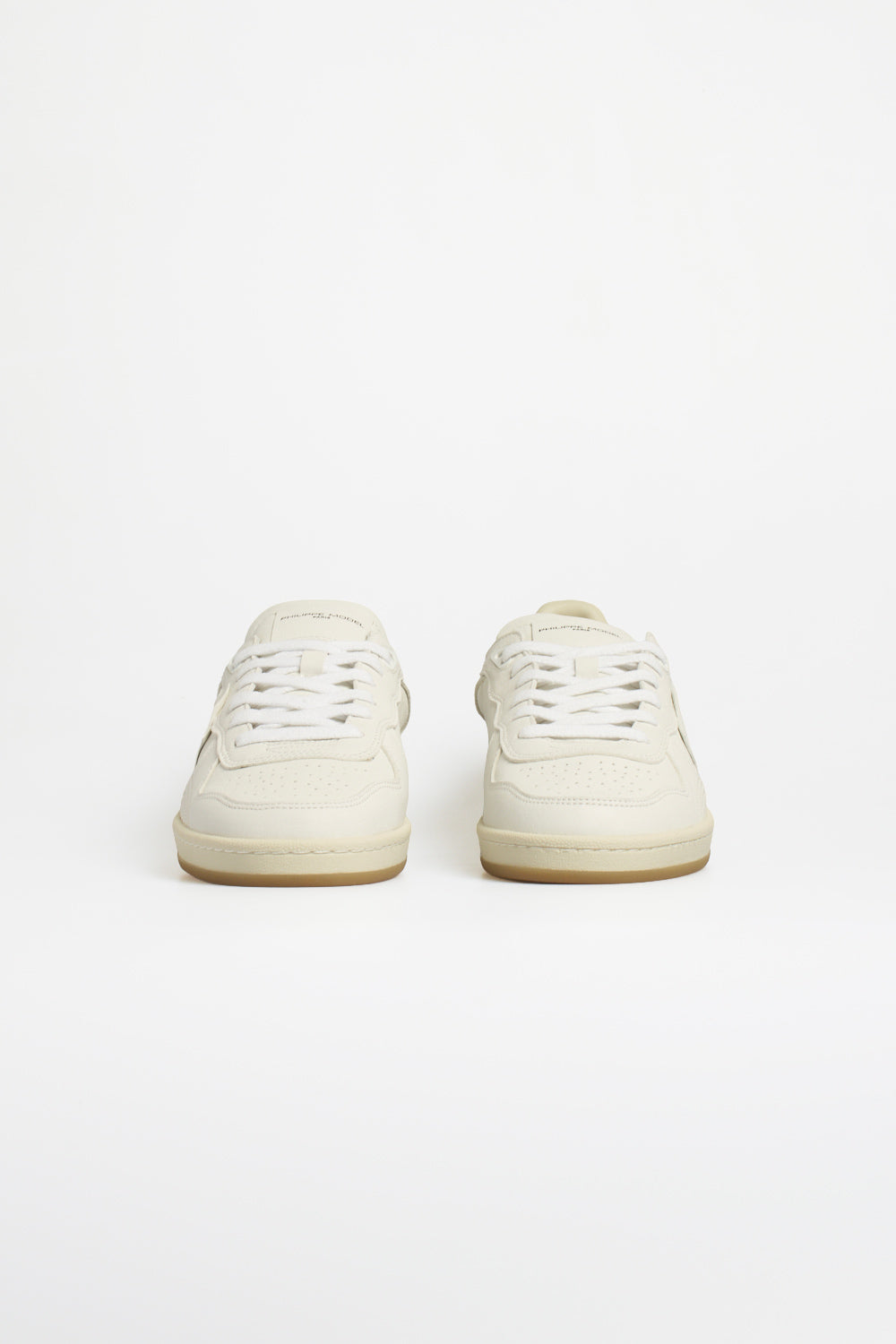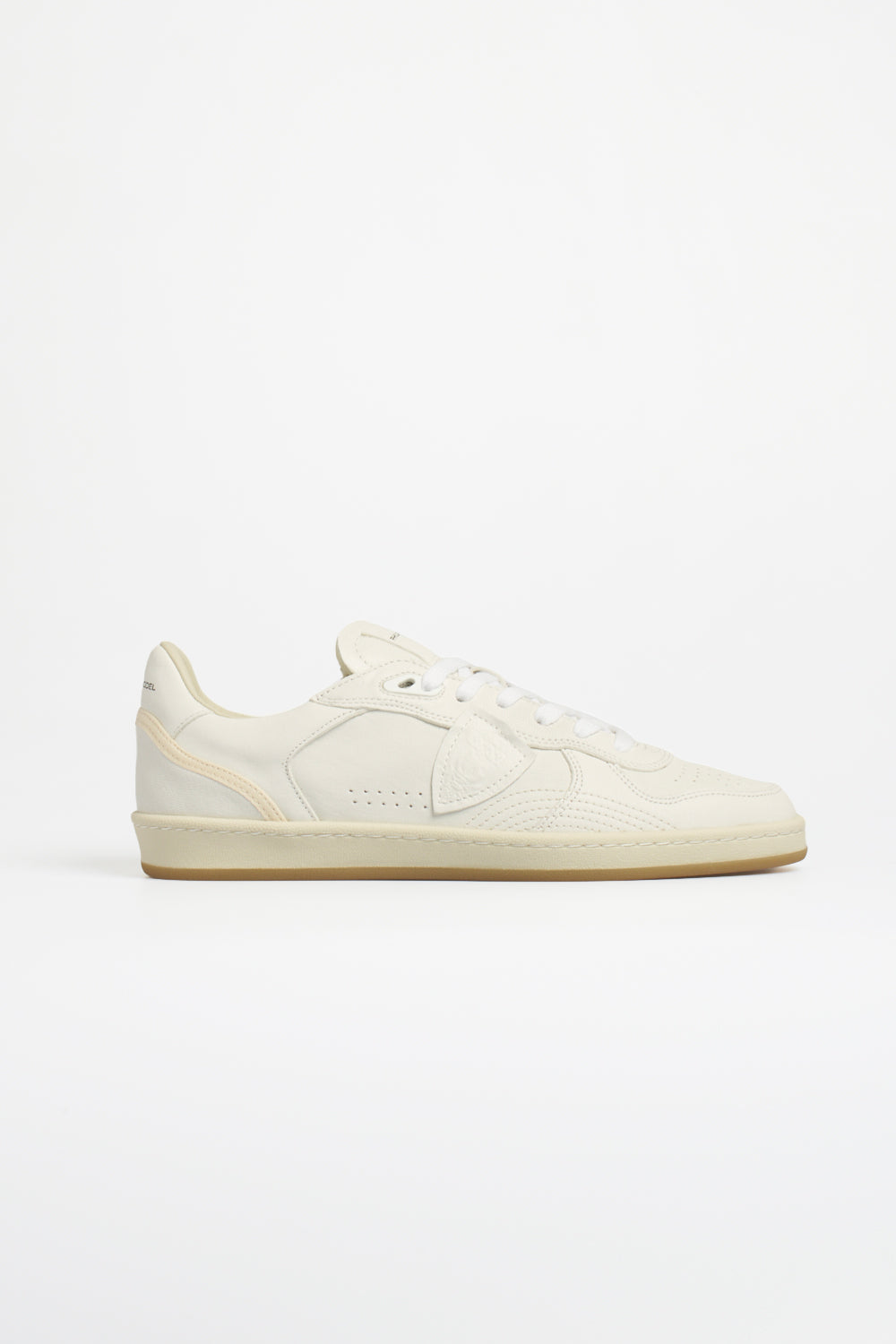 Philippe Model men's leather sneakers with a minimalist design and low-top silhouette. The upper features tone-on-tone inserts, micro-perforations on the sides, and the iconic shield applique, the brand's distinctive element.