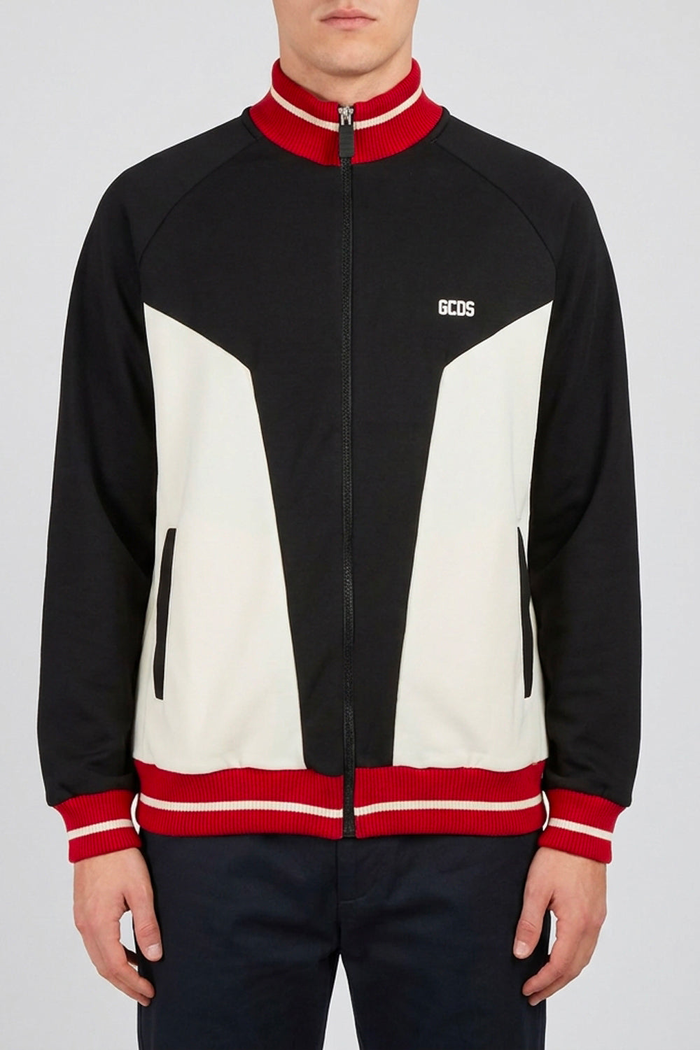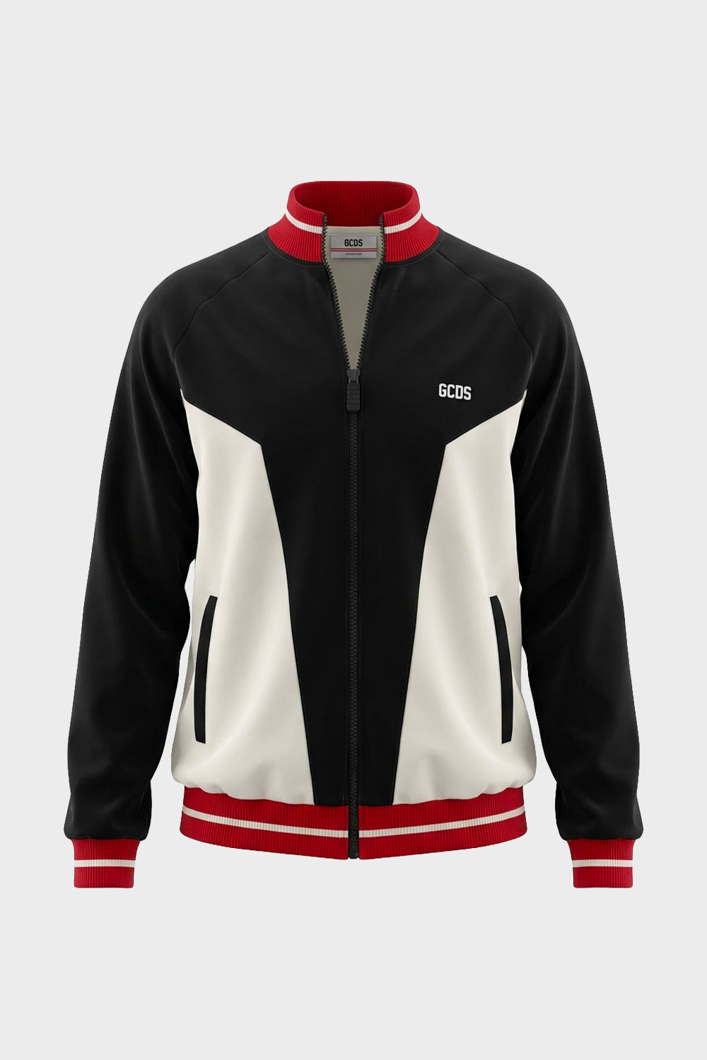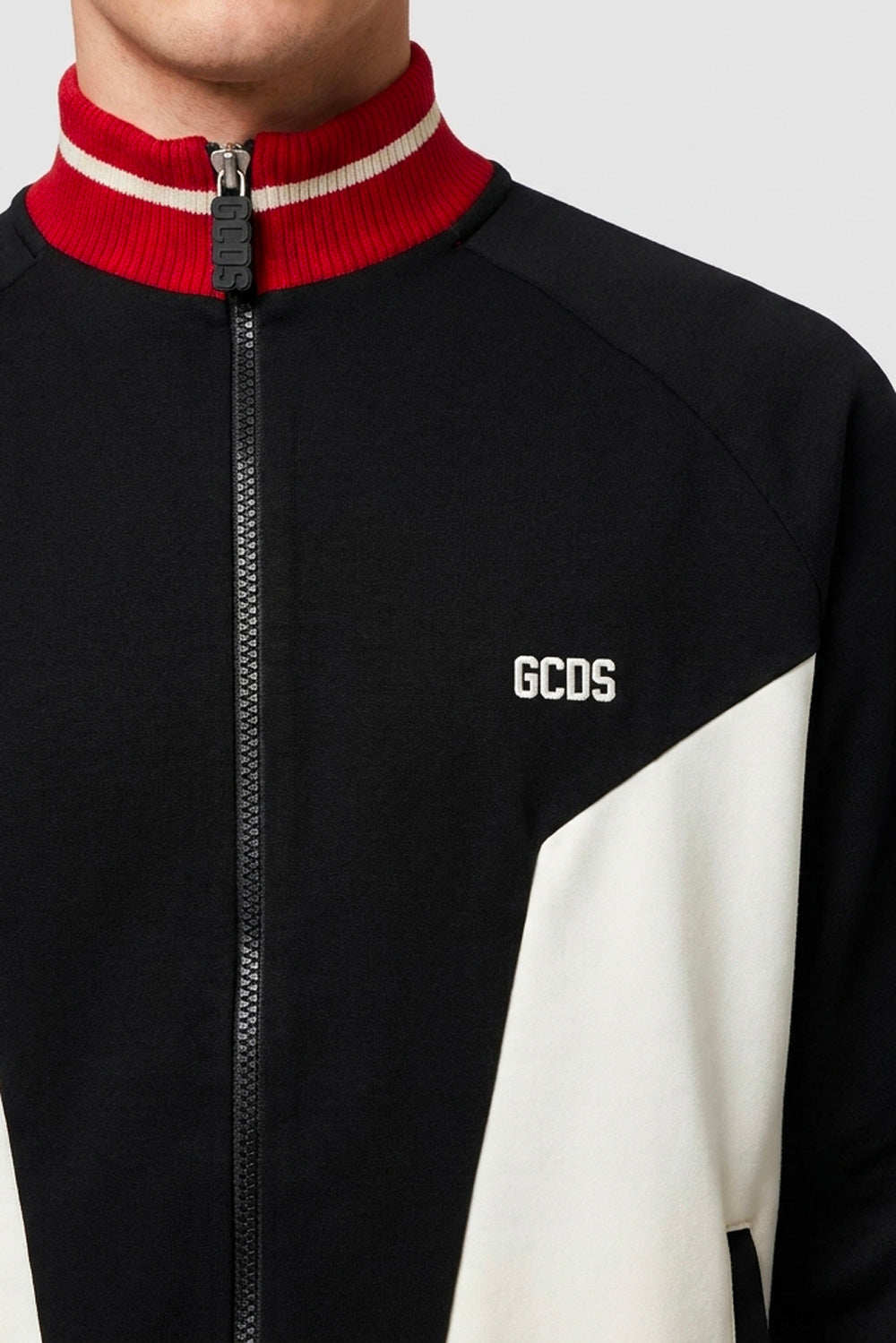 Sports track jacket by GCDS, featuring a bold and graphic colour-block design. The garment features a black main body with contrasting white geometric inserts on the front and black panels on the long sleeves. The high collar, cuffs, and hem are made from vibrant red ribbed knit, finished with a thin white central stripe. Equipped with a full-length black front zip closure with a custom GCDS logo puller and two side welt pockets. The white GCDS logo is embroidered on the left chest.