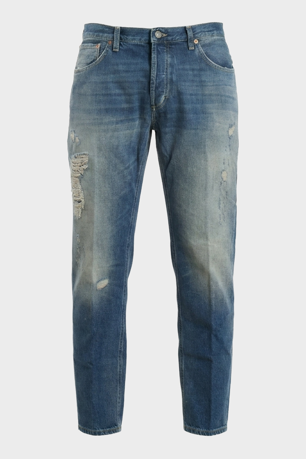 Dondup jeans, Brighton model, featuring a light denim wash with a trendy vintage and worn effect. The design is defined by obvious rips and tears localized on the legs, giving the garment an urban and gritty character, ideal for sophisticated casual looks. It features the classic five-pocket construction with a slim fit that follows the line of the leg, enriched by contrasting stitching and visible metal buttons that highlight its authentic aesthetic.