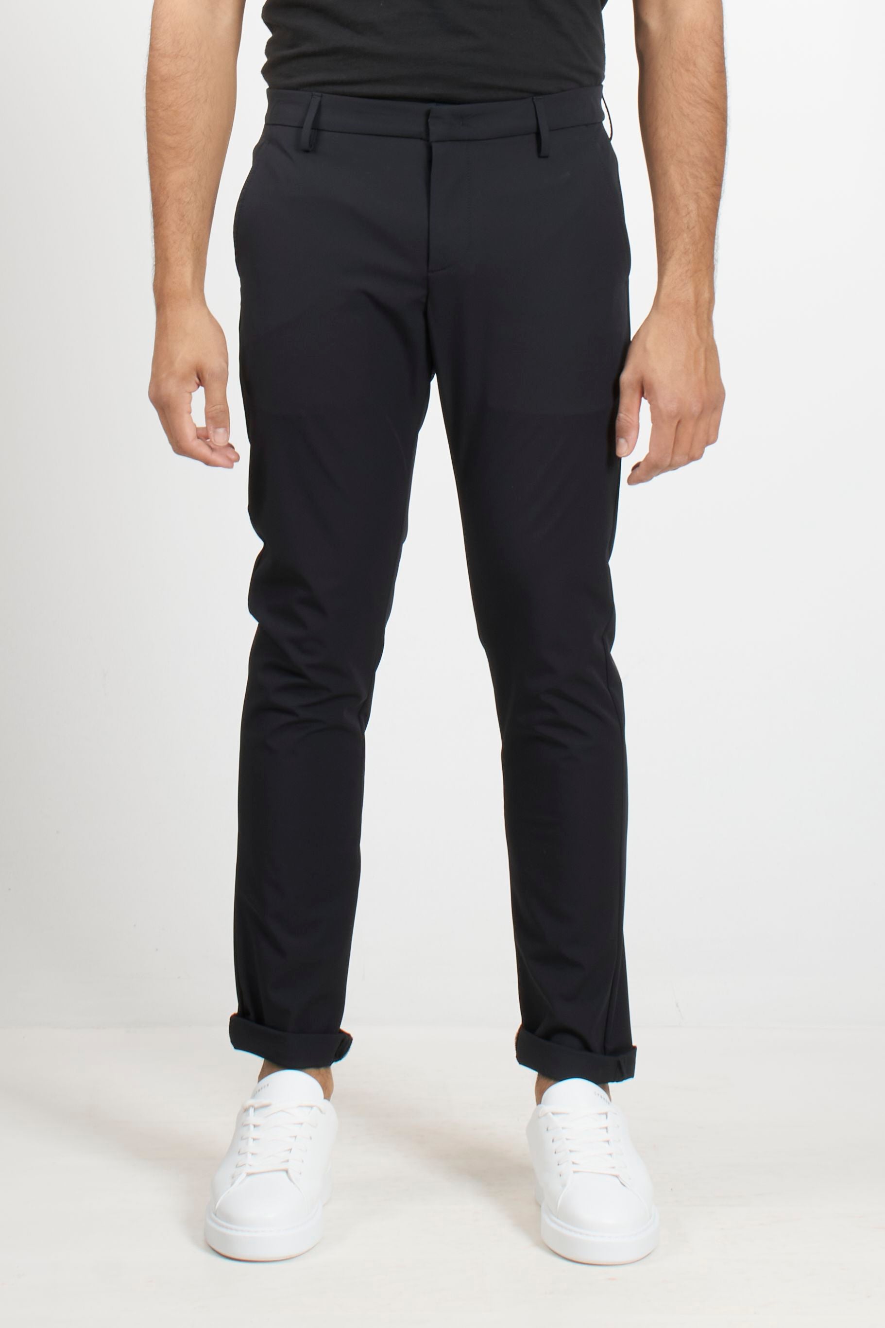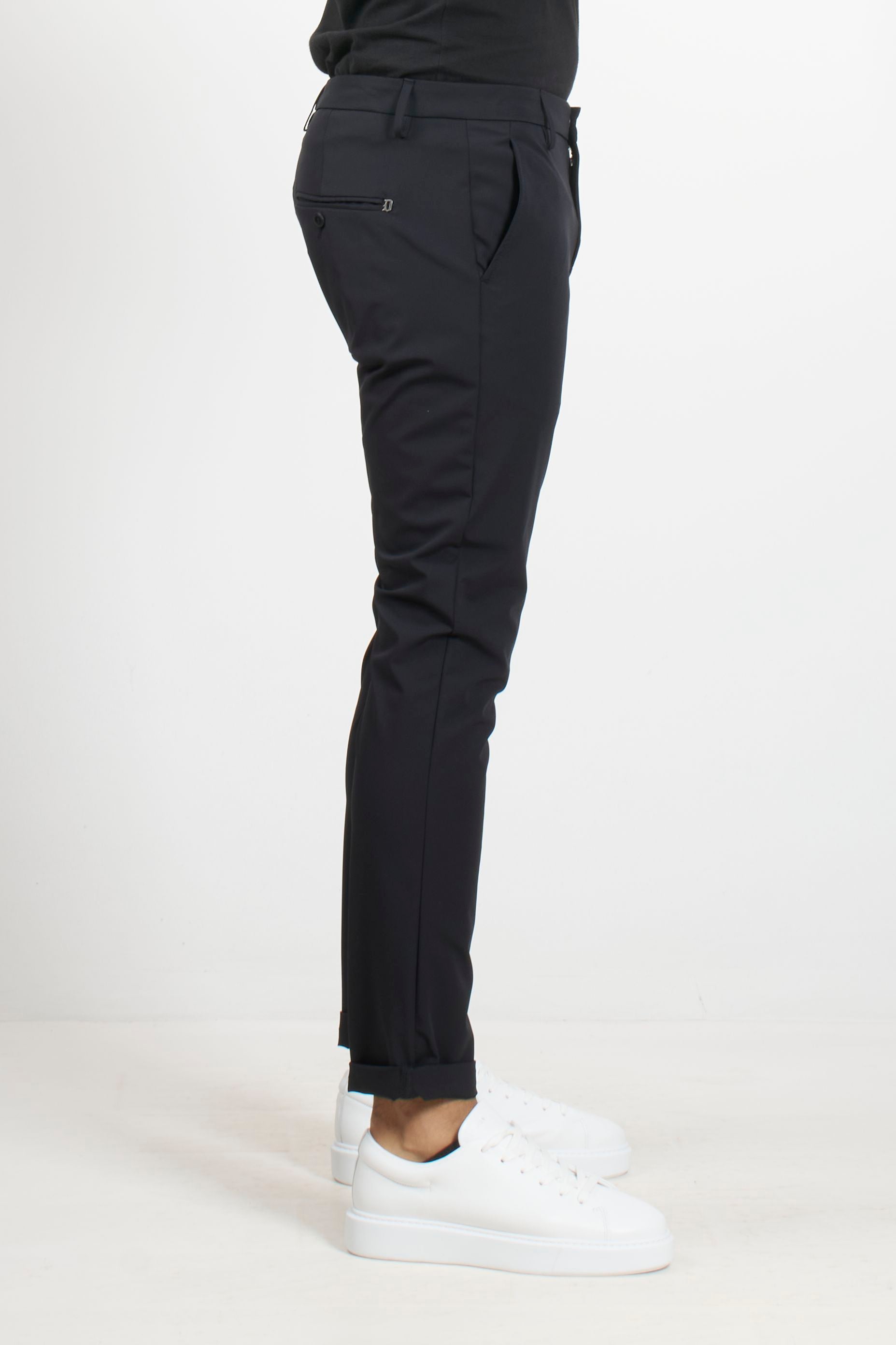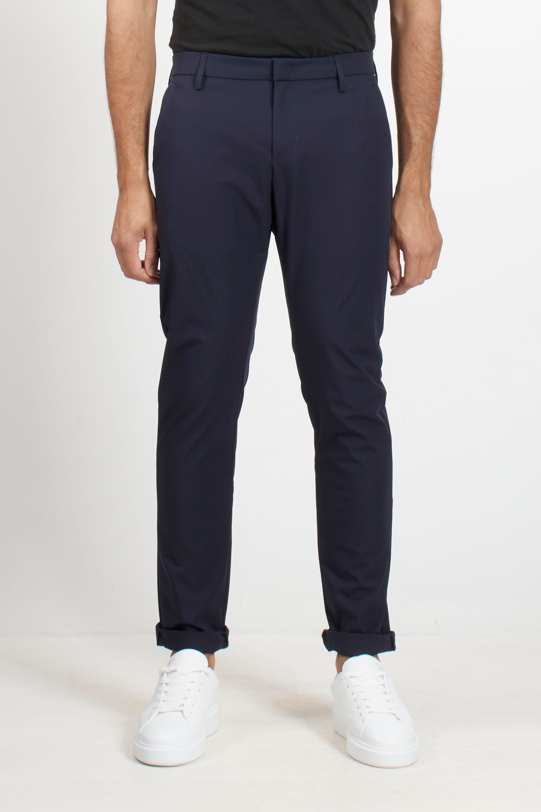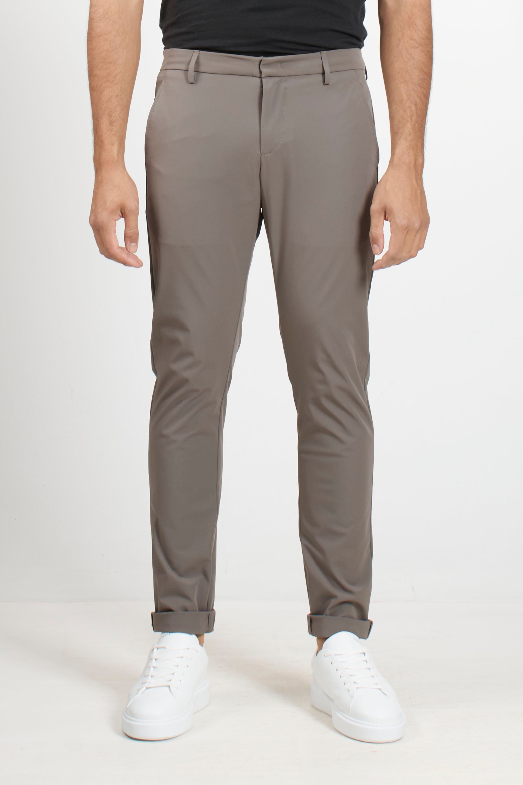 These Dondup trousers combine the comfort of technical jersey with a clean, tailored fit. The Gaubert model stands out for its side welt pockets and straight leg, offering a minimalist, crease-resistant silhouette. A versatile piece ideal for those seeking a dynamic yet impeccable look.