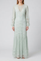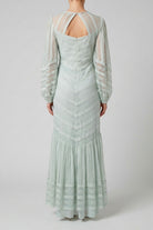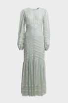 Raffinato abito longuette firmato Twinset, che incarna un'eleganza romantica e senza tempo in una delicata tonalità verde acqua. Il capo si distingue per la pregiata lavorazione sartoriale che alterna intarsi di pizzo floreale a inserti in tessuto ton sur ton disposti a spina di pesce, creando un sofisticato gioco di texture e trasparenze. Il design presenta maniche lunghe leggermente a sbuffo con polsini alti e una gonna movimentata da un'ampia balza al fondo che dona volume e leggerezza alla figura. Perfetto per cerimonie primaverili e occasioni speciali che richiedono un look sofisticato e iper-femminile.