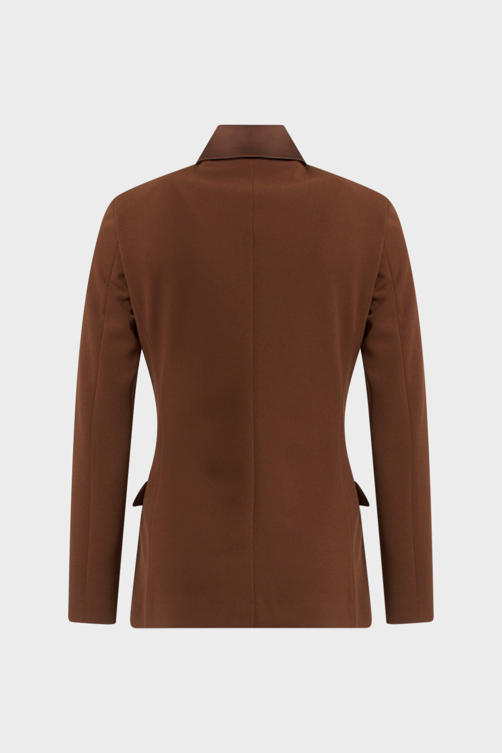 Blazer Vicolo dal taglio sartoriale e dall'eleganza intramontabile, che interpreta il classico smoking in una tonalità calda e sofisticata. La struttura impeccabile è definita dai rever a lancia in satin lucido che creano un raffinato contrasto materico con il corpo della giacca, mentre la chiusura a doppio petto sottolinea la silhouette con precisione. Un capo iconico del guardaroba femminile, perfetto per cerimonie o per dare un tocco di classe a un look serale deciso.