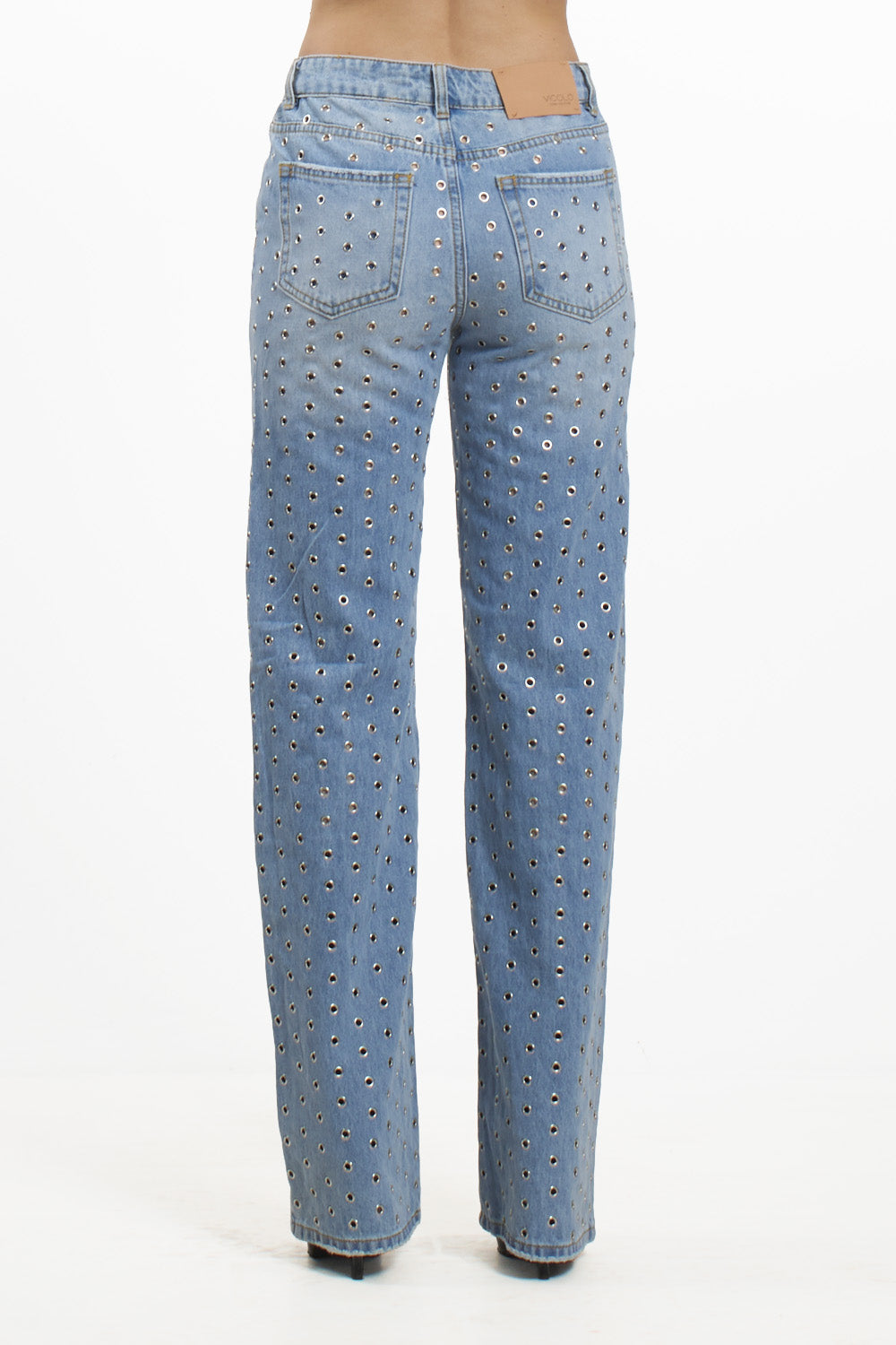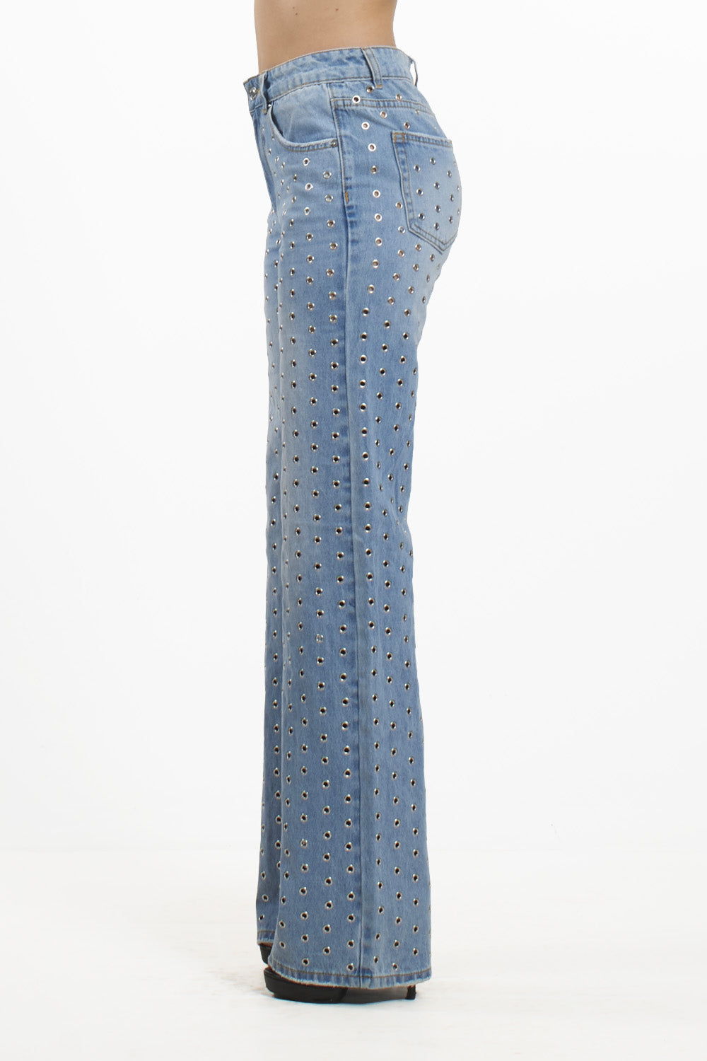 Dettagli: Lavaggio denim chiaro, applicazione all-over di occhielli metallici, cinque tasche, fondo ampio
