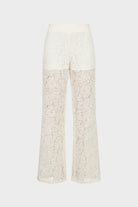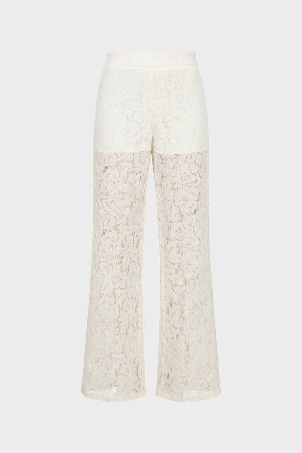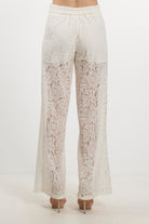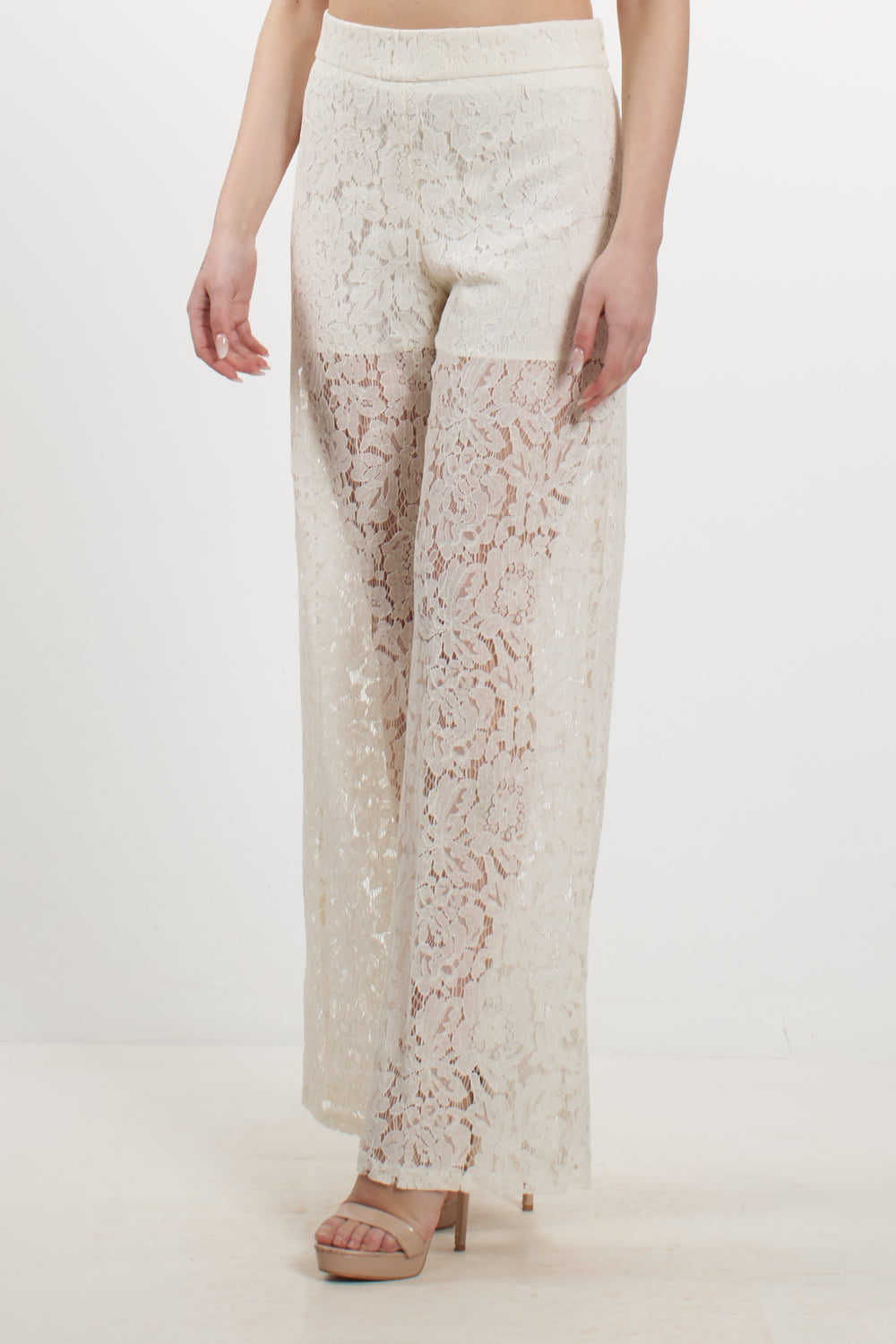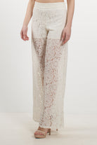 Elegante pantalone a gamba larga di No Secrets, interamente realizzato in pizzo fiorato dalla texture delicata. Il modello presenta una linea fluida e sofisticata, con vita alta definita e una mezza fodera interna (shorts) che copre la parte superiore, lasciando le gambe in trasparenza dal ginocchio in giù per un raffinato gioco di vedo-non-vedo. Perfetto per cerimonie o per un look serale d'effetto.