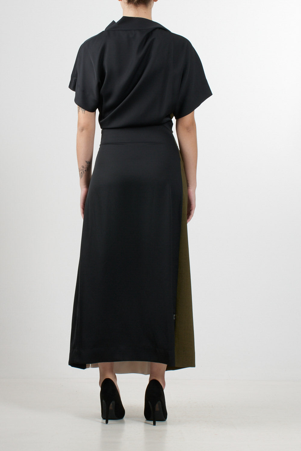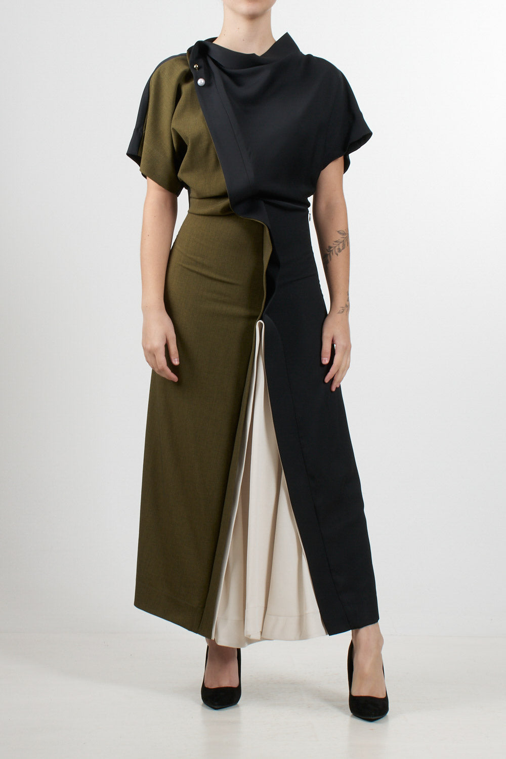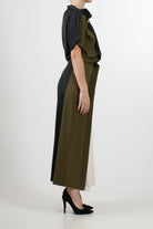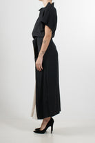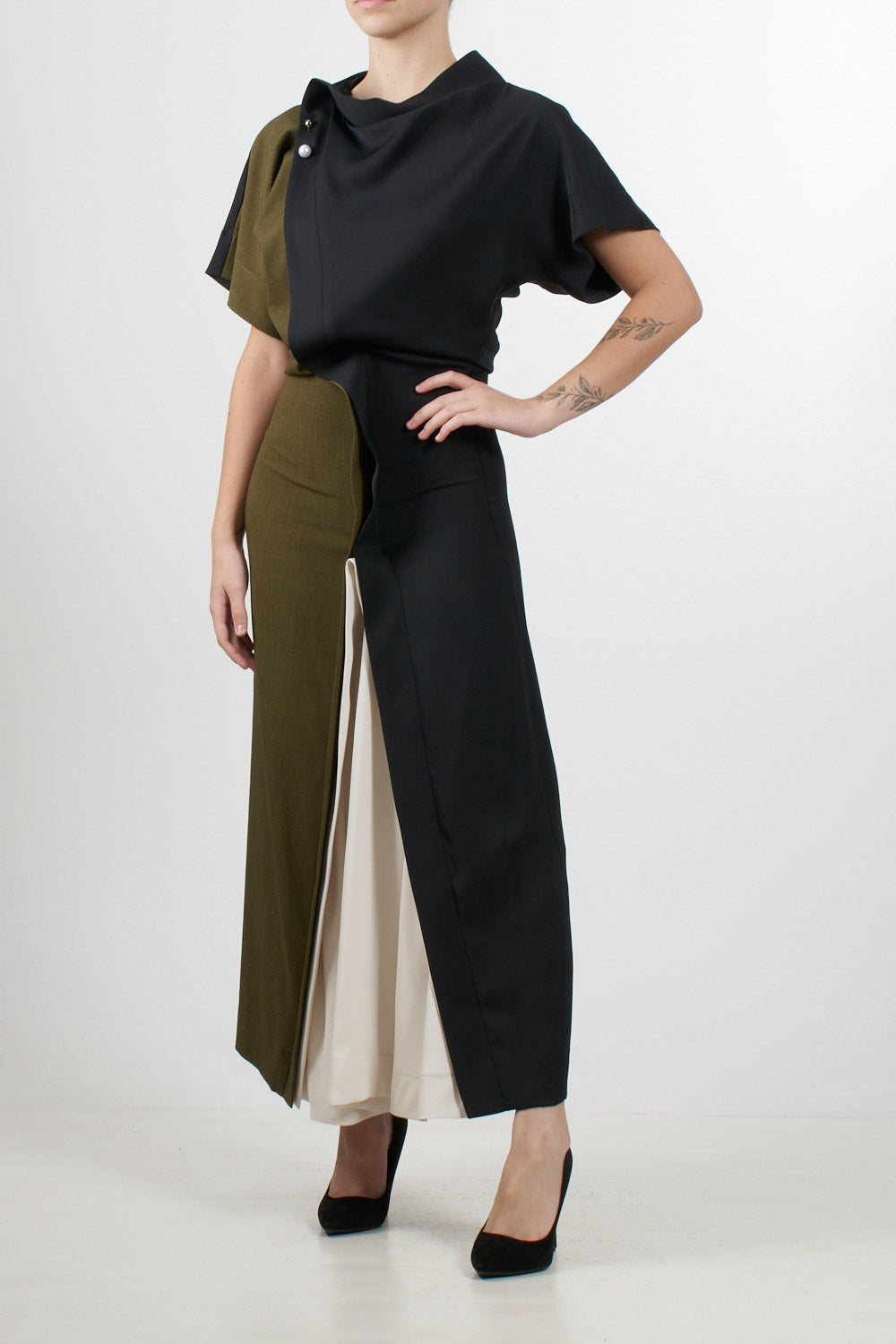 Abito lungo Jijil a maniche corte, design asimmetrico e multistrato, applicazione gioiello sul collo, parte inferiore arricchita da inserti color panna che donano movimento e leggerezza al capo. Lo scollo morbido e la costruzione sartoriale rendono l’abito ideale per occasioni eleganti e serate speciali.