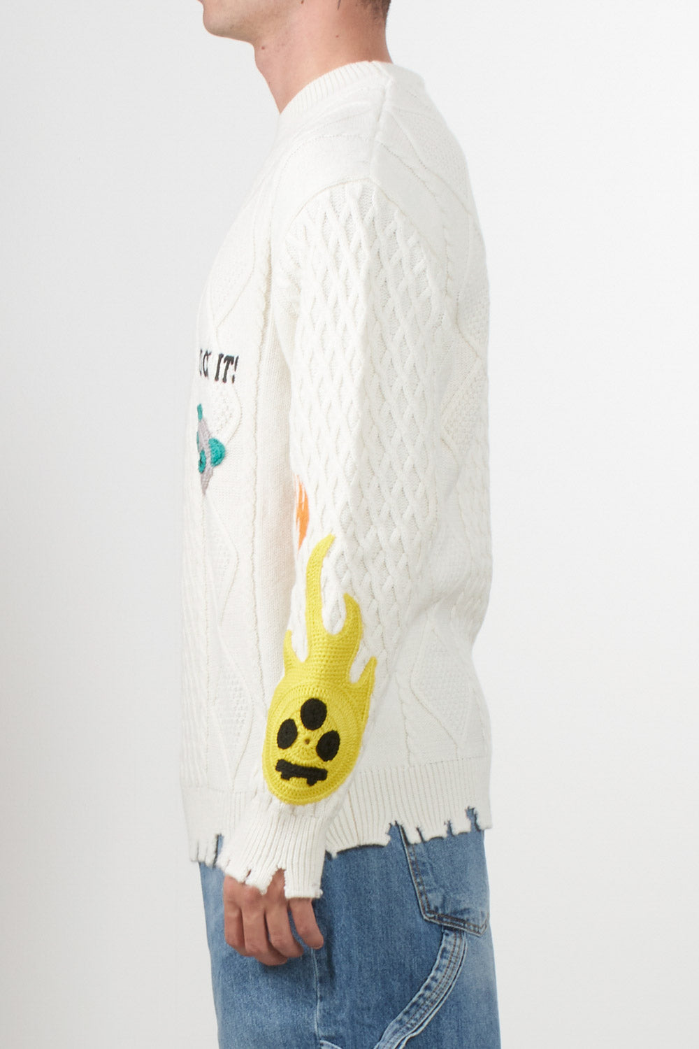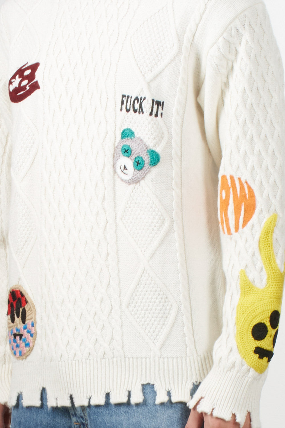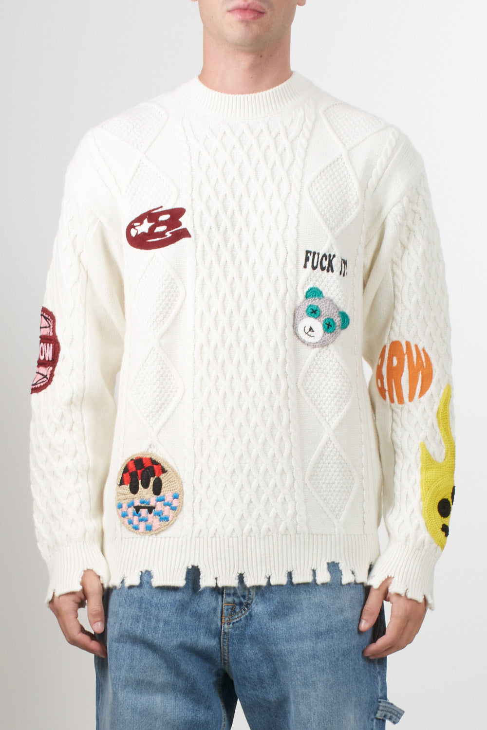 Maglione girocollo firmato Barrow, realizzato in puro cotone con lavorazione a trecce e dettagli dal gusto street. Il design si distingue per le patch colorate e i ricami distribuiti sul davanti e sulle maniche, che raffigurano simboli pop, scritte e grafiche ironiche come l’iconico orsetto e una fiamma stilizzata. I bordi sfrangiati e il finish vissuto donano un tocco grunge e ribelle al capo. Un modello unisex dalla vestibilità comoda, perfetto per aggiungere personalità a ogni look casual.