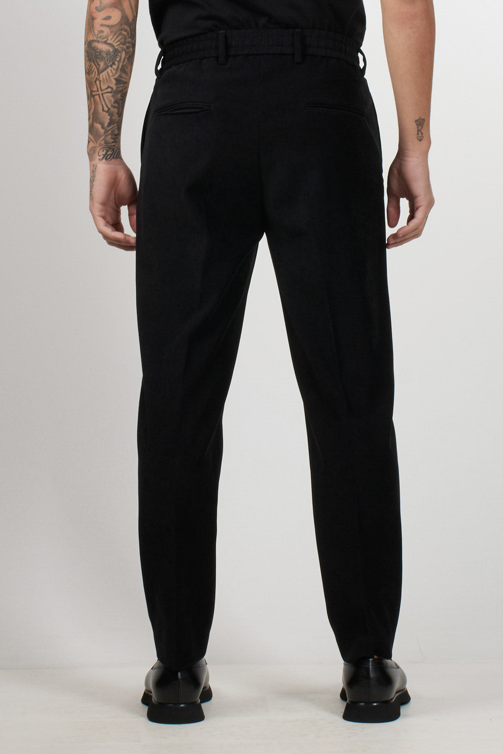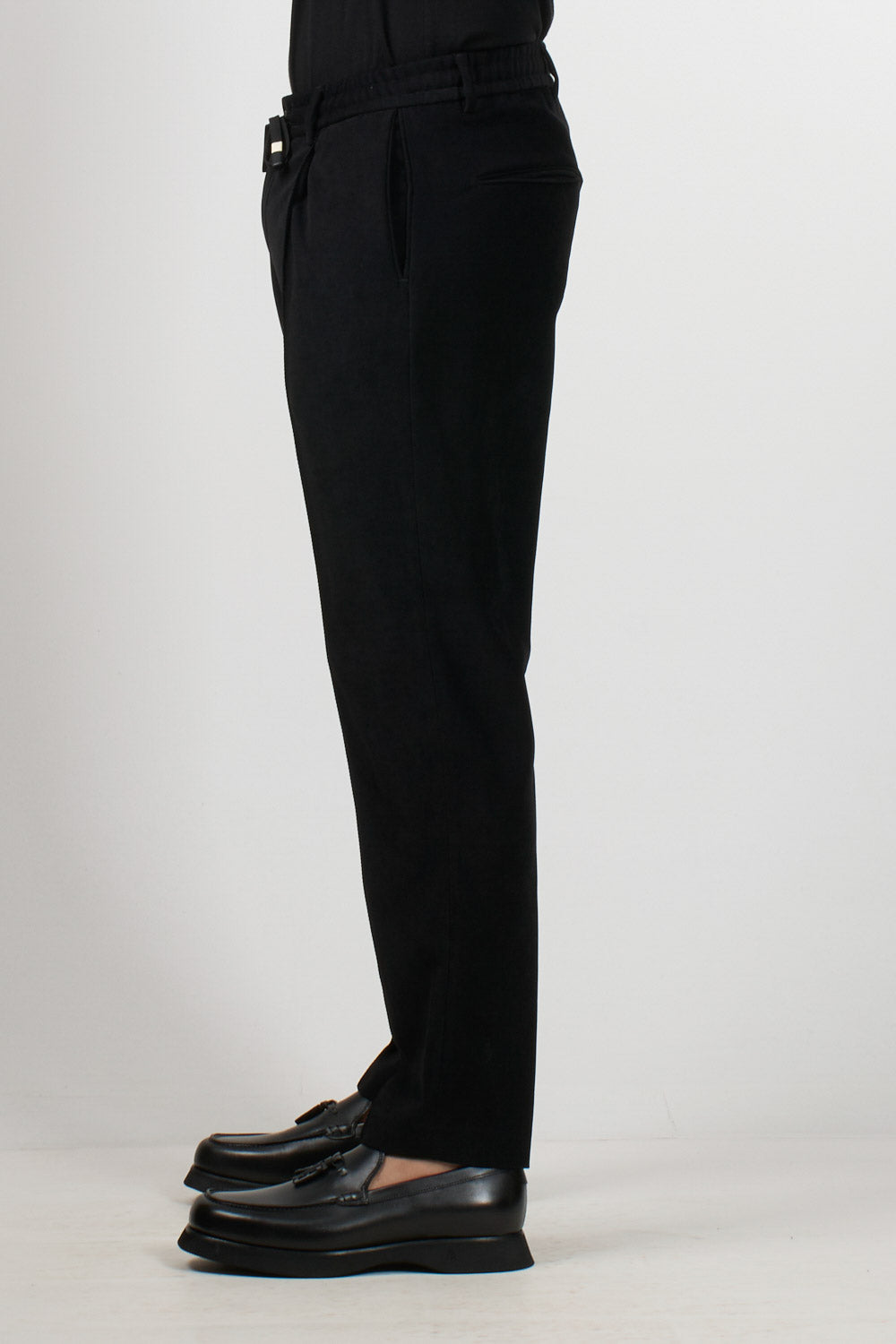 Pantalone Daniele Alessandrini dal taglio moderno e raffinato, realizzato in morbido tessuto effetto scamosciato che offre comfort e stile contemporaneo. Il modello presenta vita elasticizzata con coulisse regolabile, pinces frontali e gamba dritta. Le tasche laterali e posteriori completano il design, rendendo questo capo perfetto per look casual chic e metropolitani.