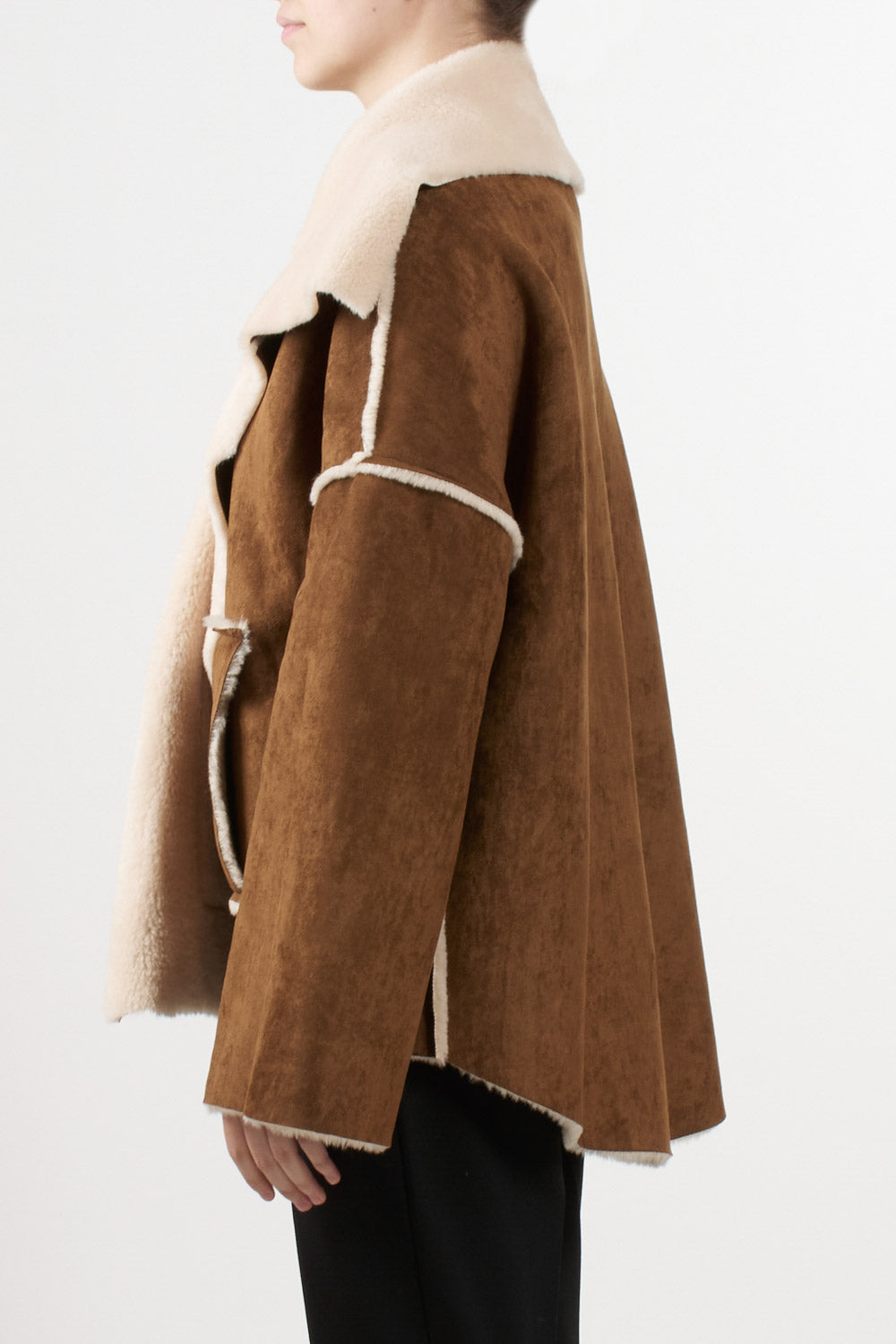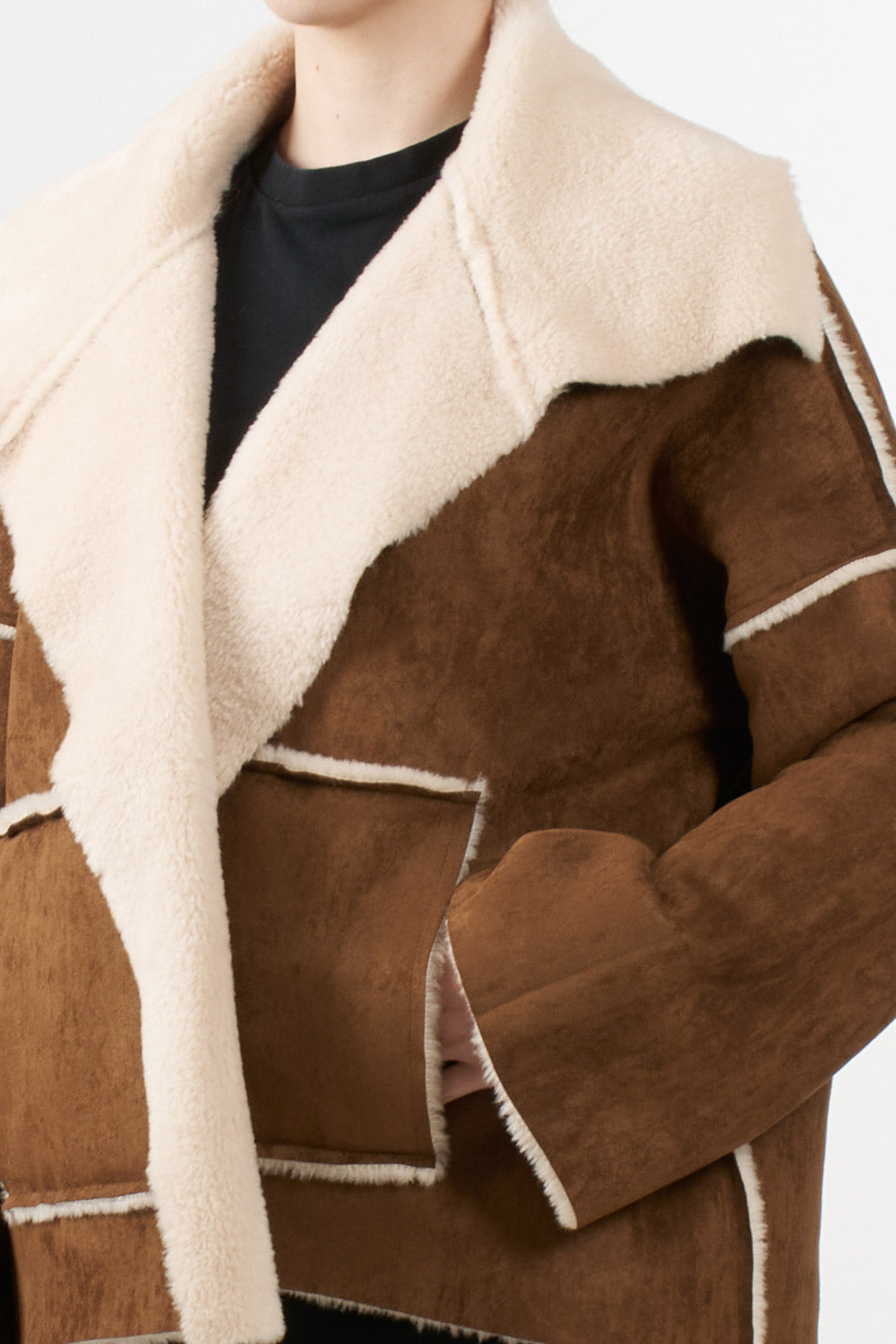 Giacca dal design caldo e avvolgente, realizzata in eco-shearling effetto montone con finitura scamosciata esterna e interno morbido in pelliccia sintetica. Il taglio è moderno e leggermente oversize, con costruzione a pannelli e profili a contrasto che valorizzano la struttura del capo. L’ampio collo sciallato in pelliccia sintetica aggiunge un tocco sofisticato e garantisce ulteriore protezione dal freddo. Il modello presenta maniche lunghe a linea dritta, tasche frontali applicate e chiusura aperta senza bottoni, per uno stile rilassato ma ricercato.