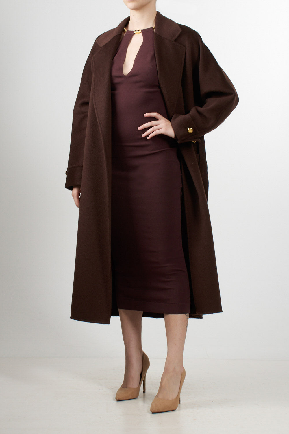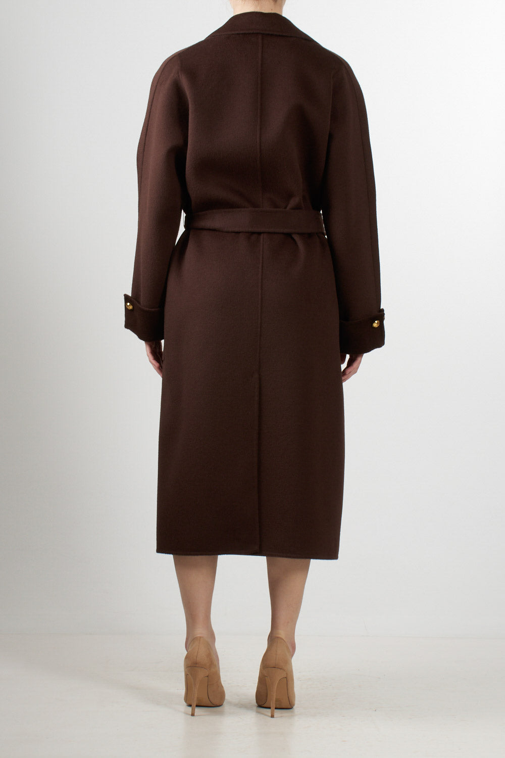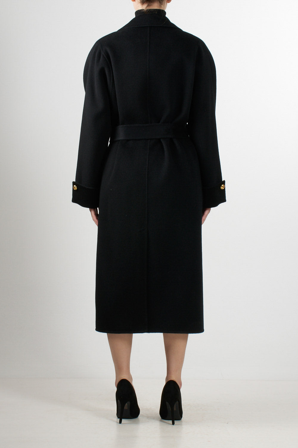 Cappotto lungo in pura lana dal taglio avvolgente, con ampio revers e cintura coordinata che valorizza il punto vita. Il modello presenta grandi tasche applicate e dettagli in metallo dorato, simbolo dell’eleganza sofisticata del brand. Vestibilità over