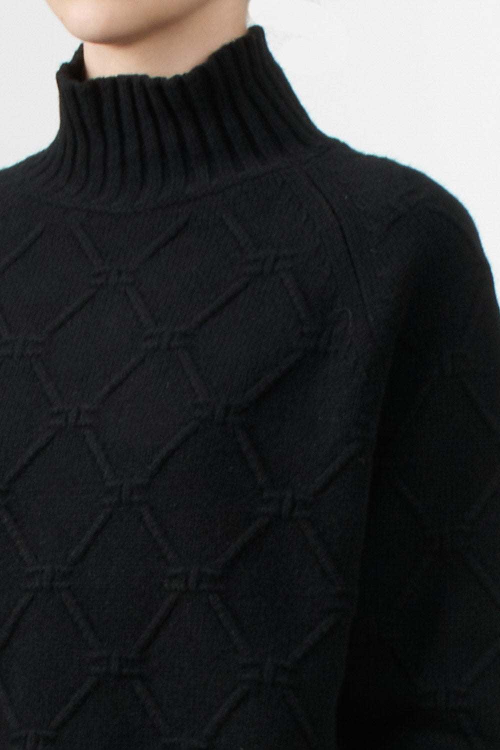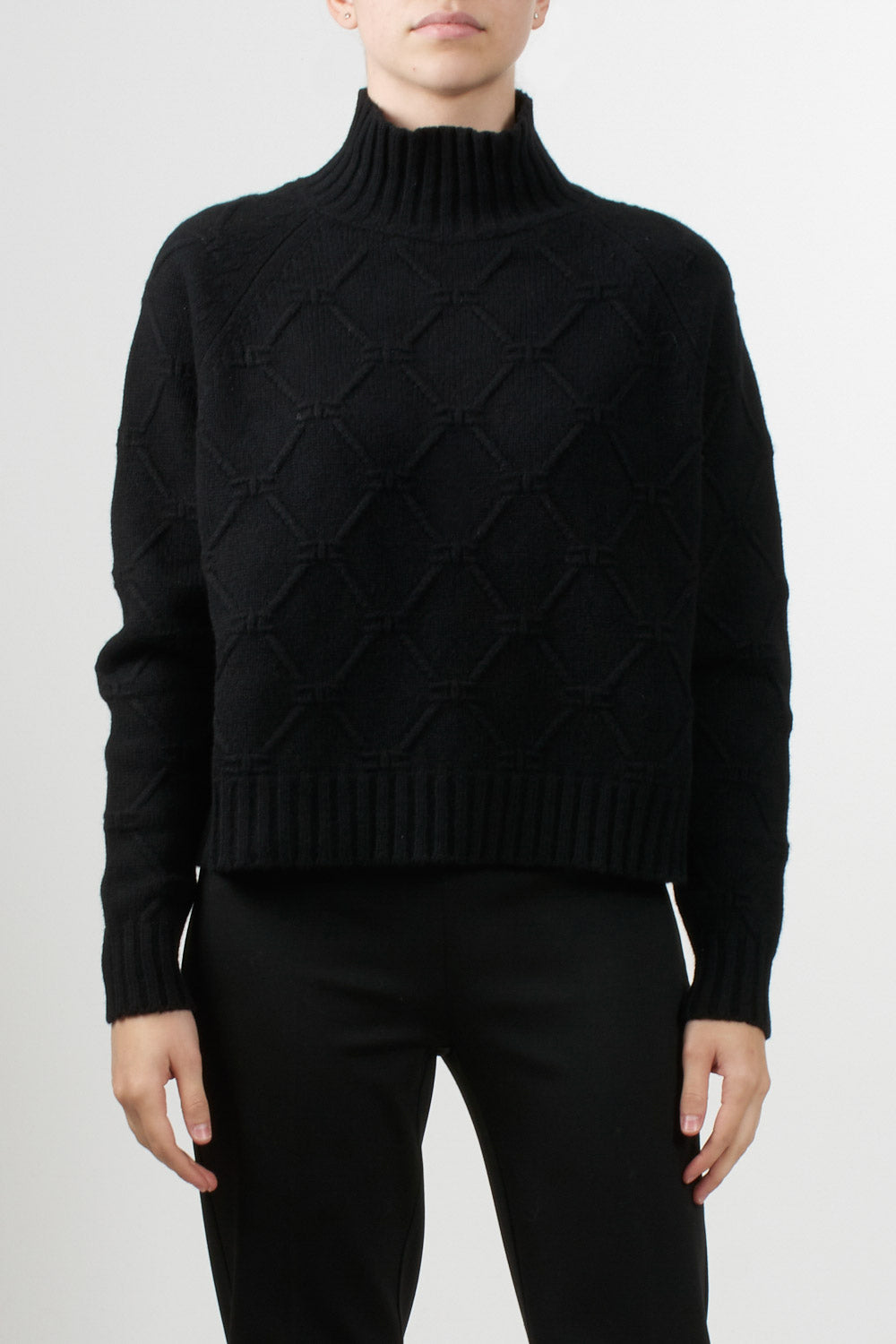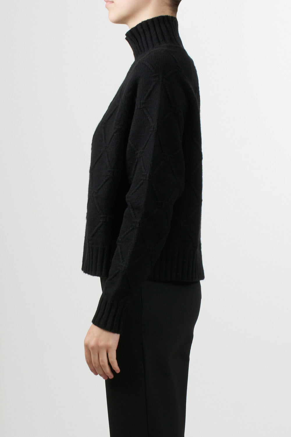 Maglia in lana e cashmere caratterizzata da collo alto a coste e lavorazione tridimensionale con motivo geometrico all-over. Il taglio regolare e la texture morbida assicurano comfort e stile in ogni occasione, ideale per la stagione invernale. Vestibilità over