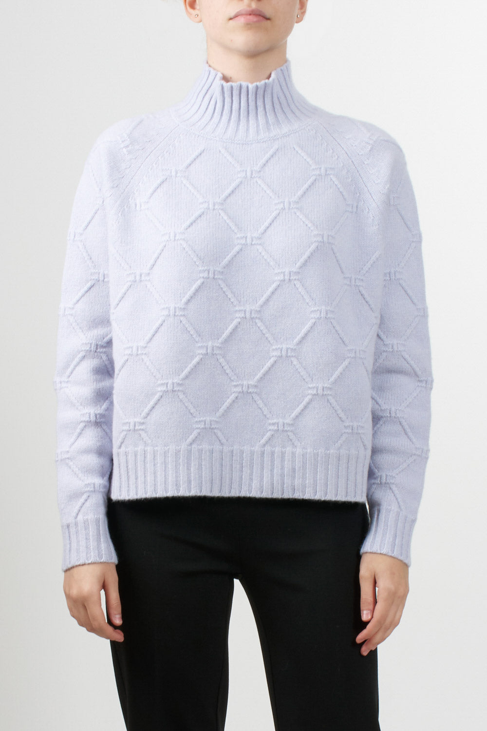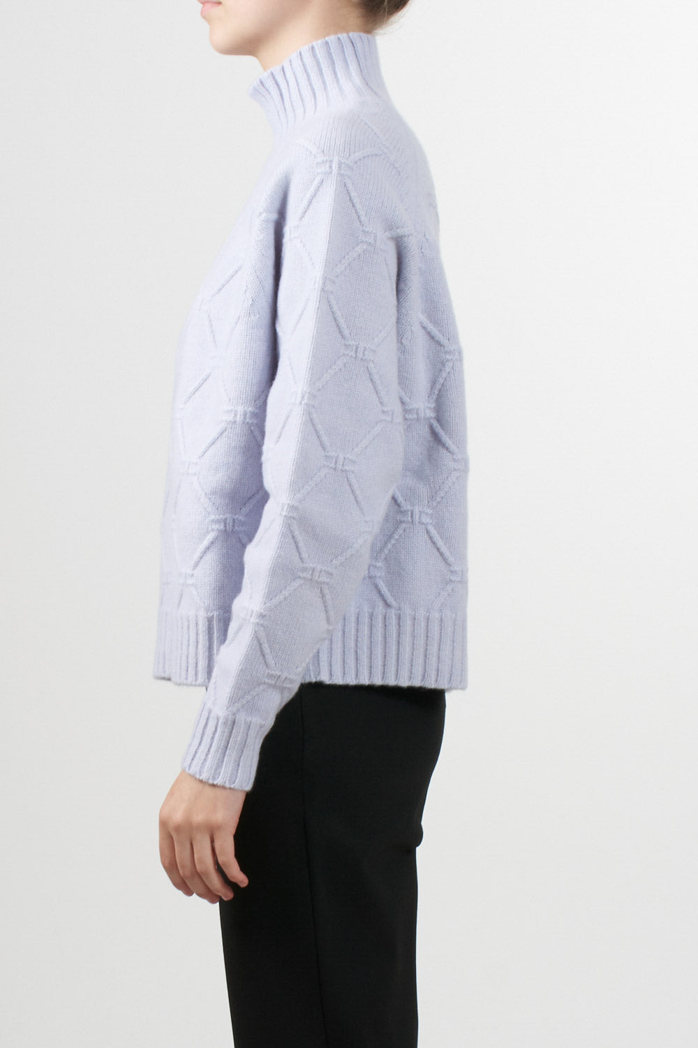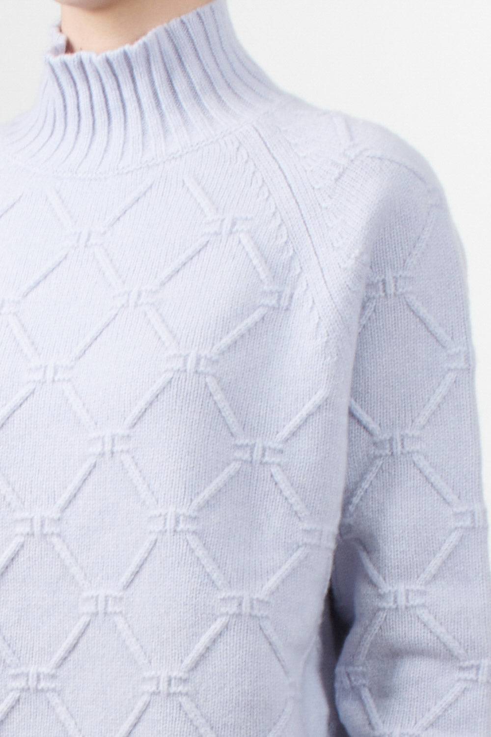 Maglia in lana e cashmere caratterizzata da collo alto a coste e lavorazione tridimensionale con motivo geometrico all-over. Il taglio regolare e la texture morbida assicurano comfort e stile in ogni occasione, ideale per la stagione invernale. Vestibilità over