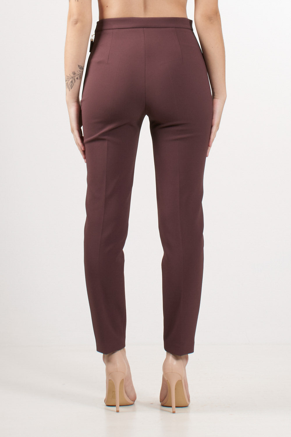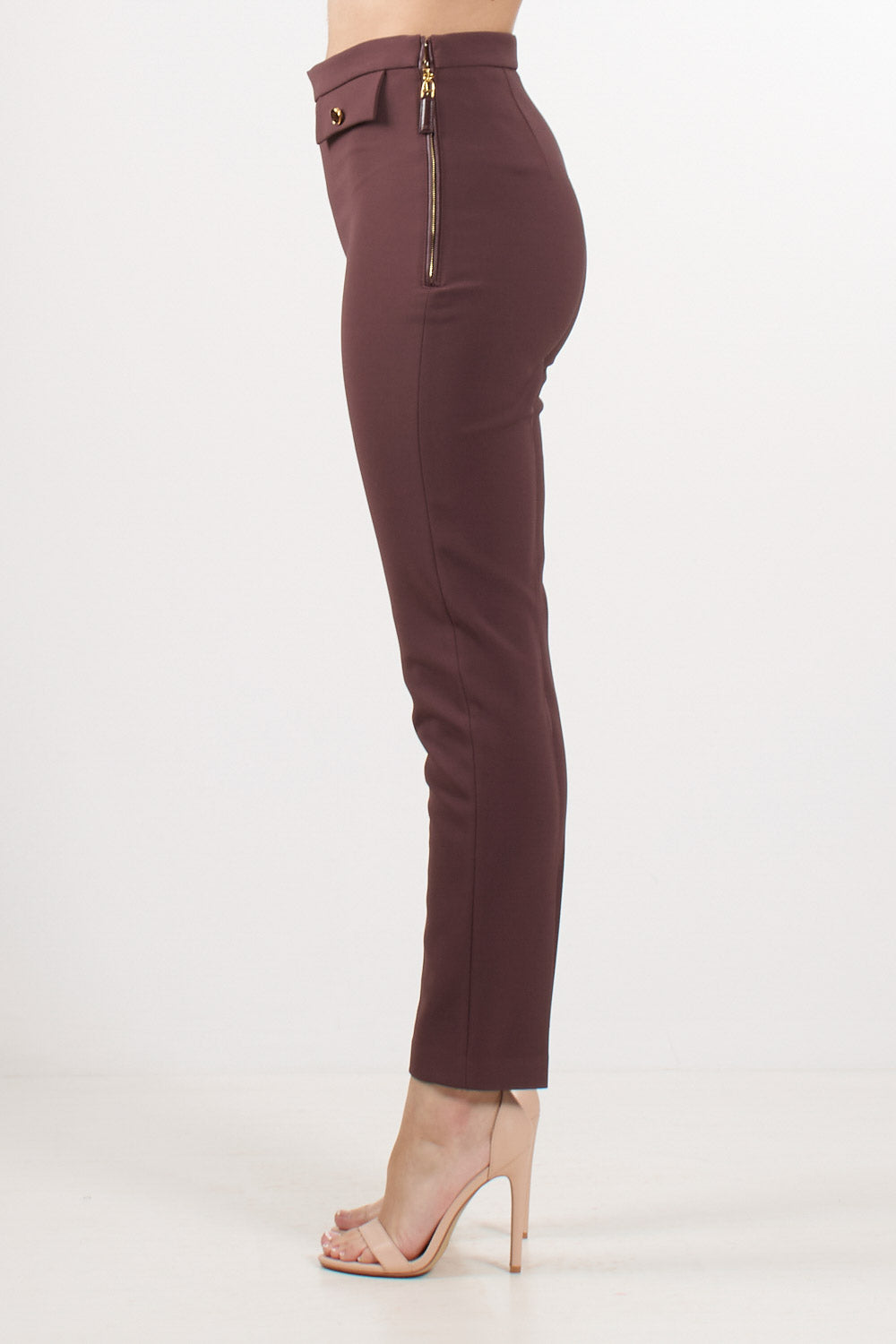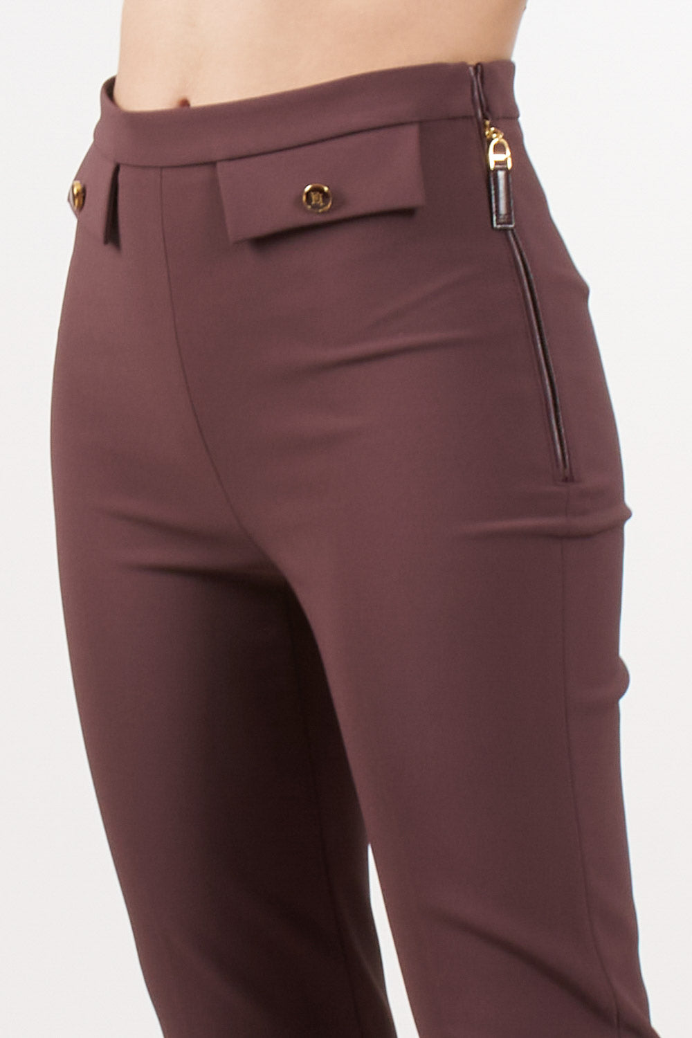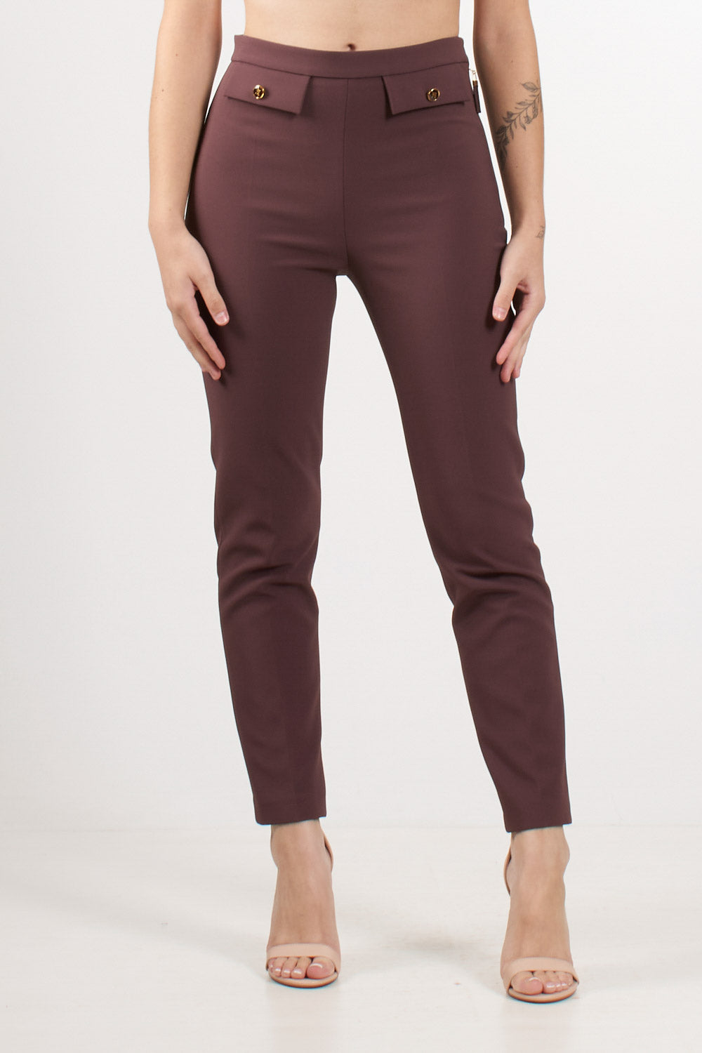 Pantaloni Elisabetta Franchi in doppio crêpe dalla vestibilità slim con lunghezza alla caviglia, patte applicate sul davanti e impreziosite da bottoni smaltati con logo, chiusura con zip laterale e tirazip.