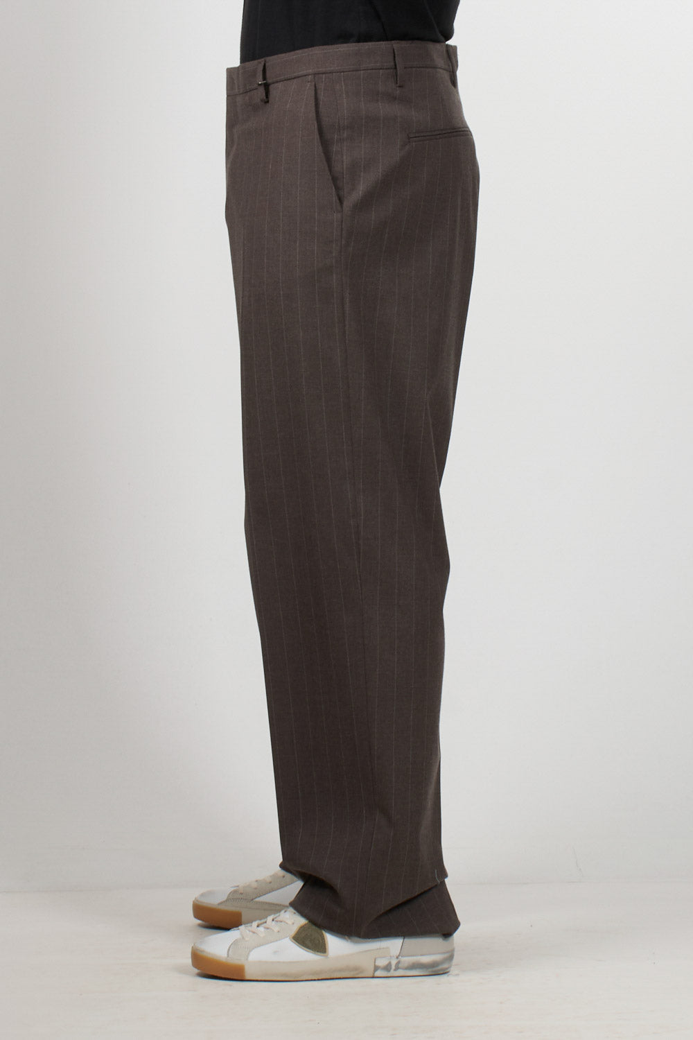 Pantalone dal taglio morbido con gamba ampia e linea gessata sottile. Un modello versatile che unisce comfort e stile, perfetto per completare outfit casual o eleganti.