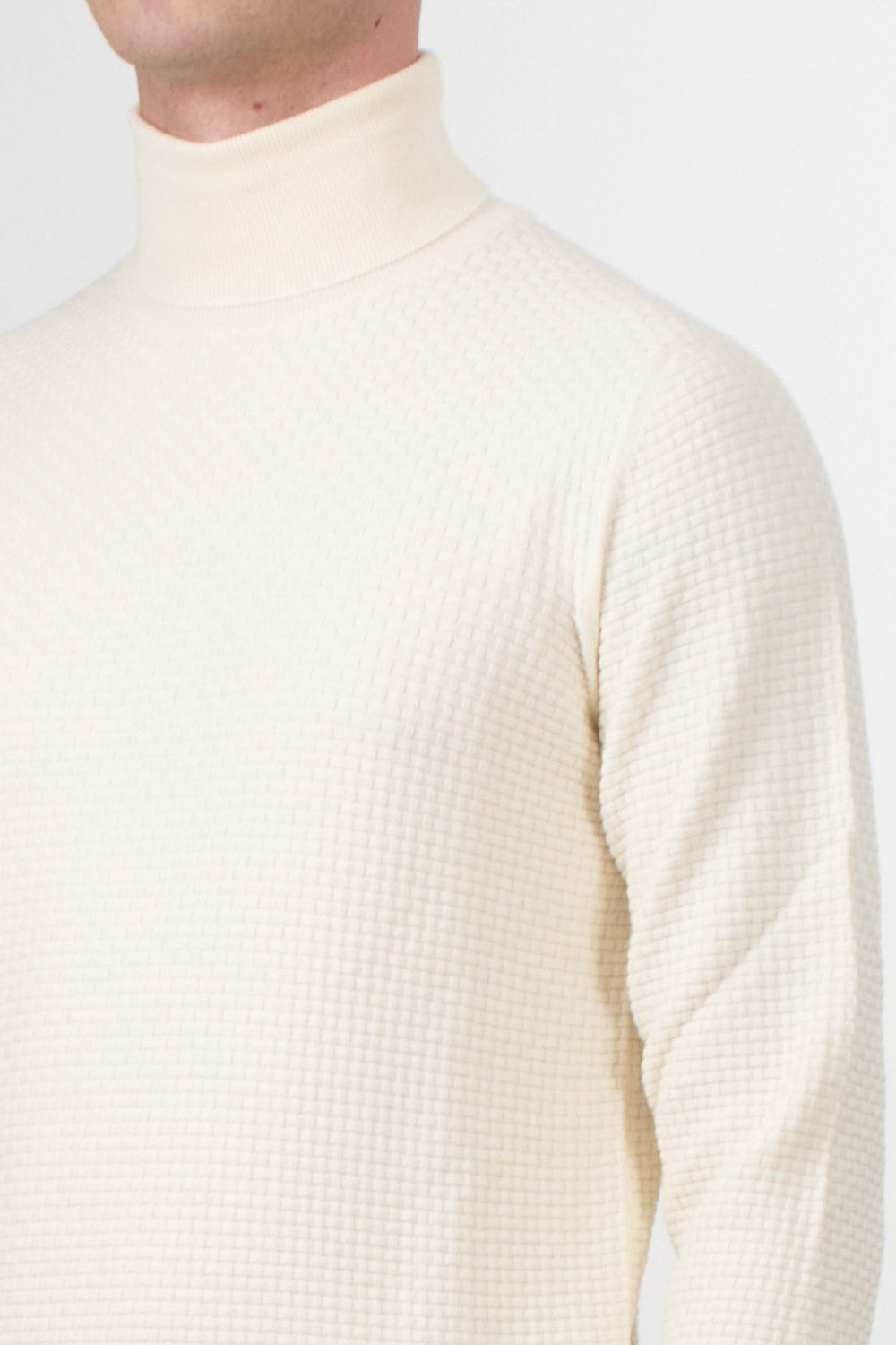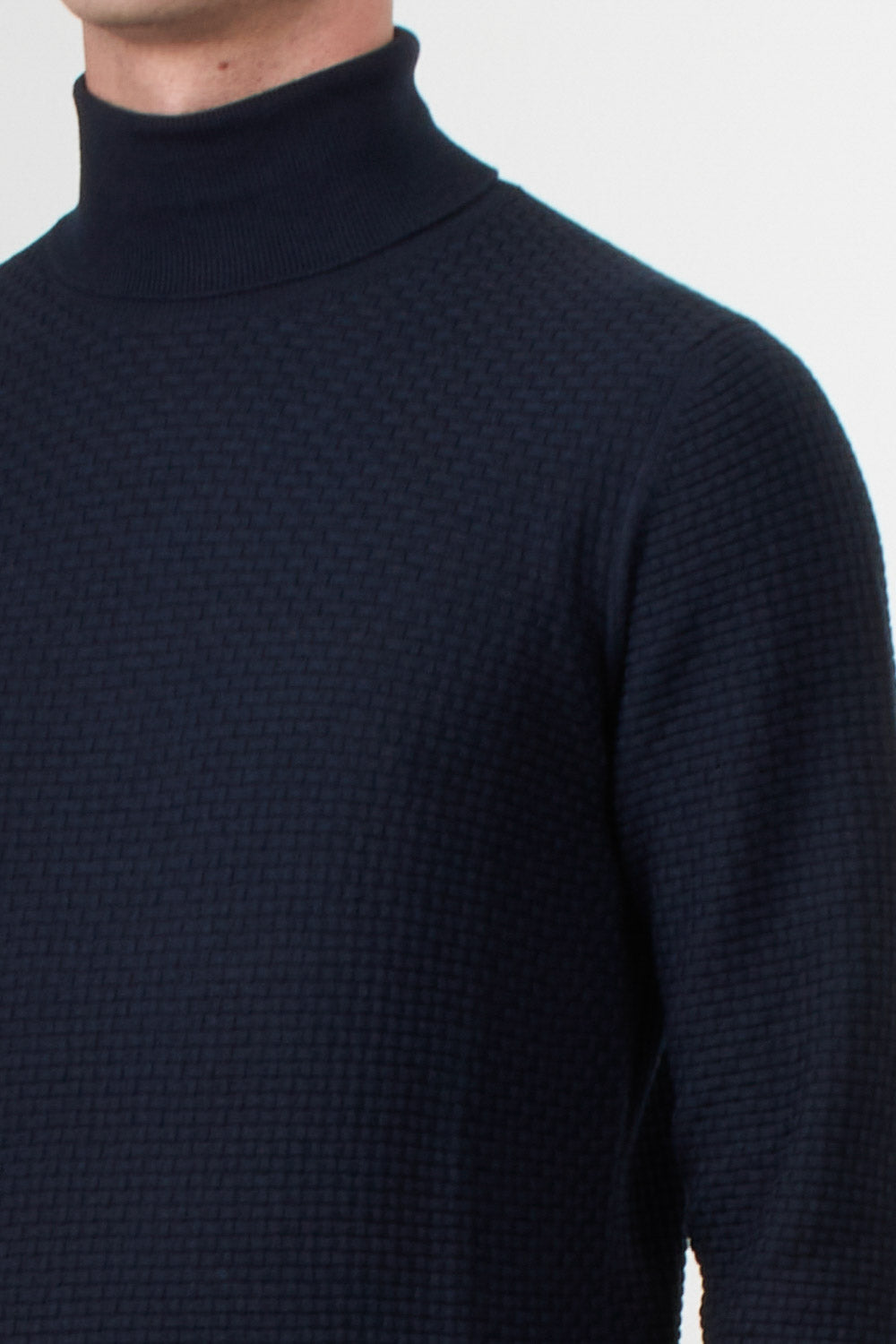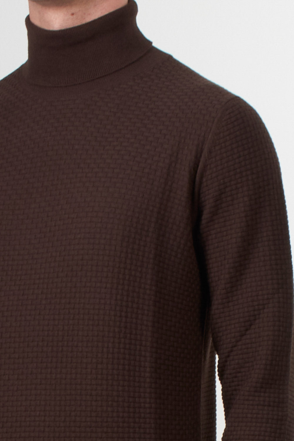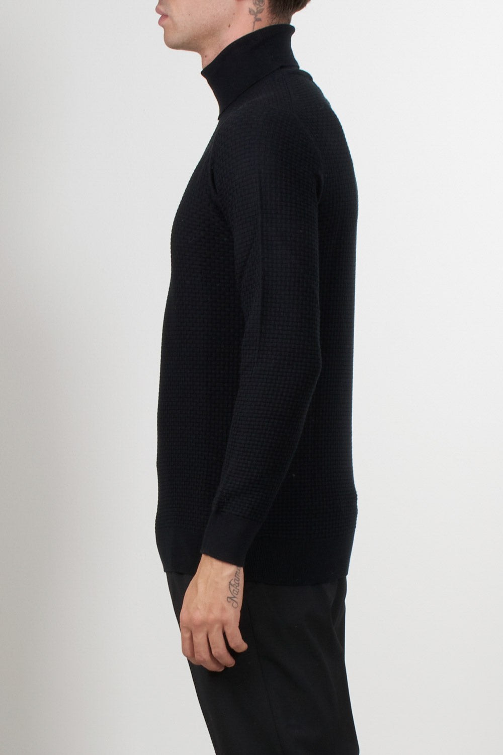 Dolcevita a maniche lunghe Masq, realizzato con una lavorazione a micro-trama che conferisce profondità e carattere al capo. Il design minimal e raffinato è valorizzato dal collo alto a coste e dalle finiture elasticizzate su polsini e fondo, per una vestibilità comoda e pulita. Perfetto da indossare sotto giacche o cappotti per un look sofisticato e contemporaneo, oppure da solo per uno stile casual di classe.