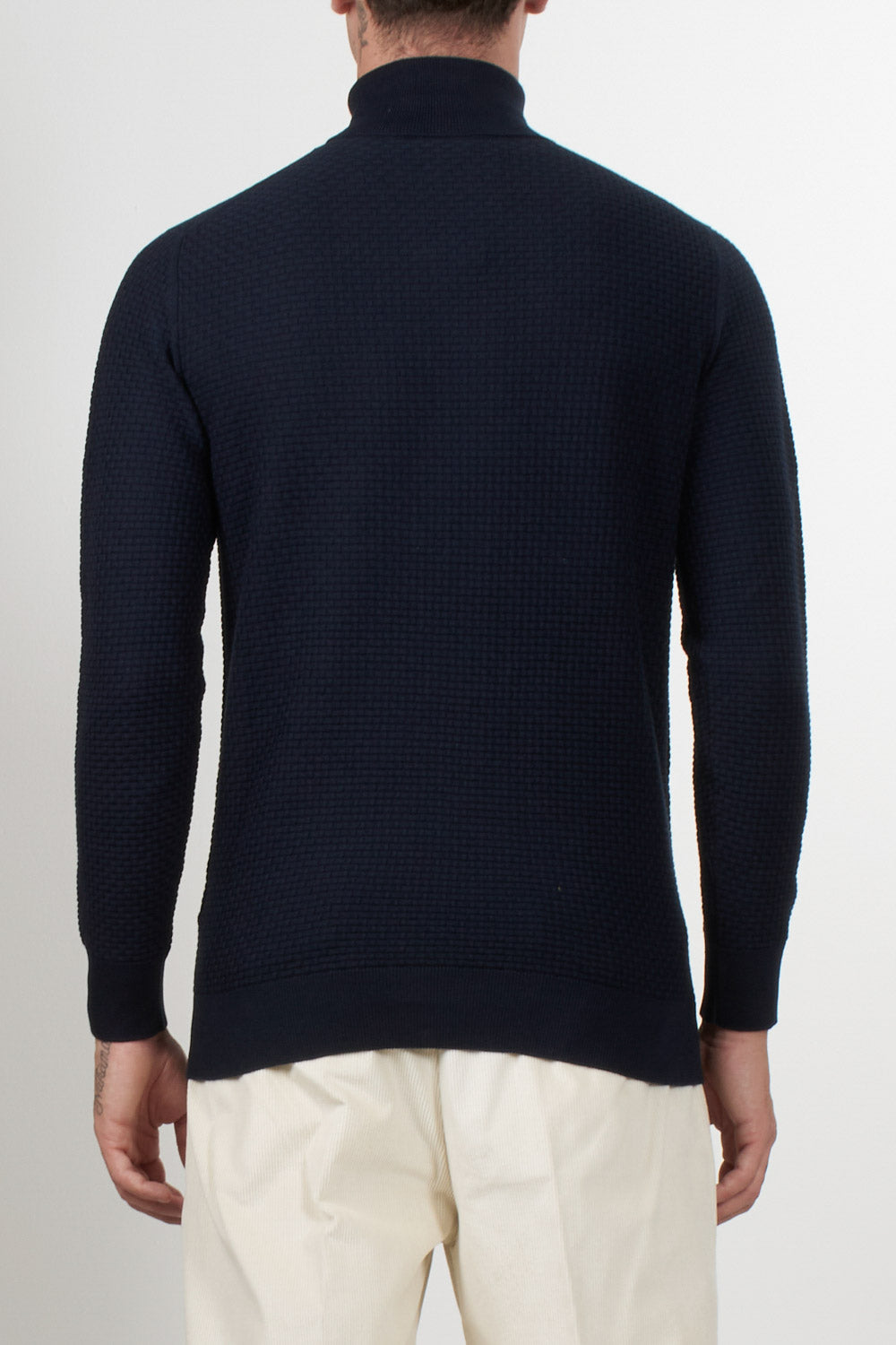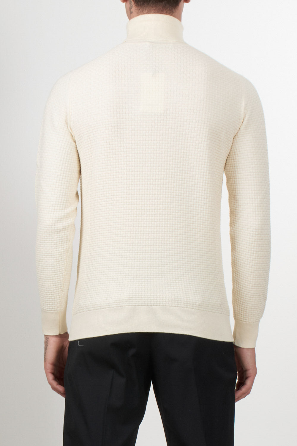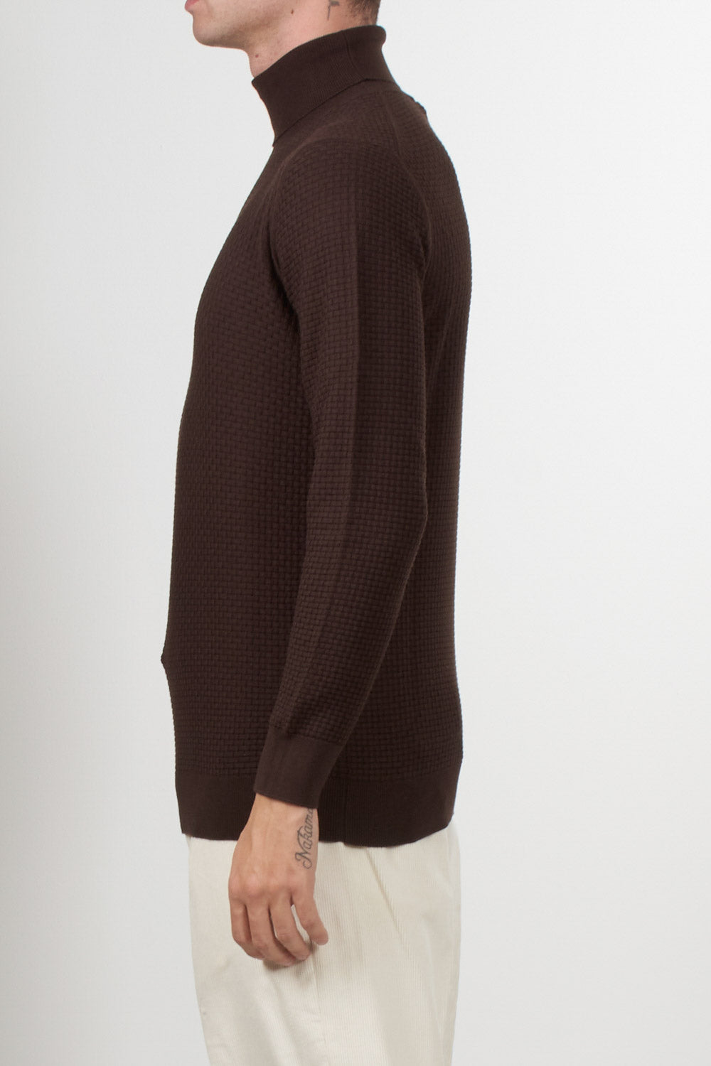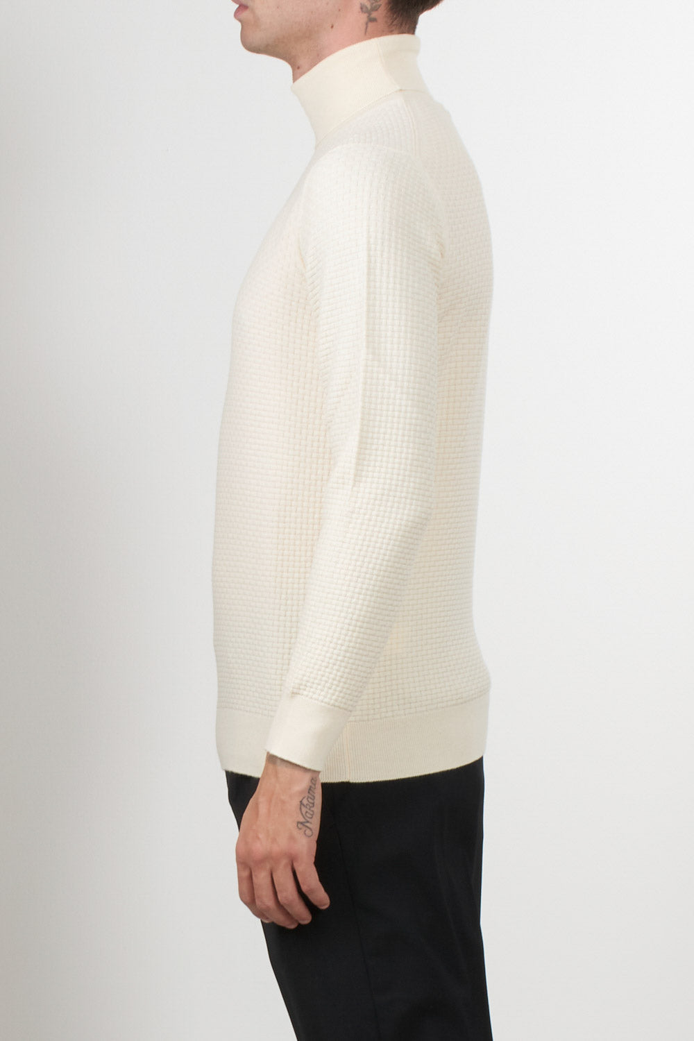 Dolcevita a maniche lunghe Masq, realizzato con una lavorazione a micro-trama che conferisce profondità e carattere al capo. Il design minimal e raffinato è valorizzato dal collo alto a coste e dalle finiture elasticizzate su polsini e fondo, per una vestibilità comoda e pulita. Perfetto da indossare sotto giacche o cappotti per un look sofisticato e contemporaneo, oppure da solo per uno stile casual di classe.