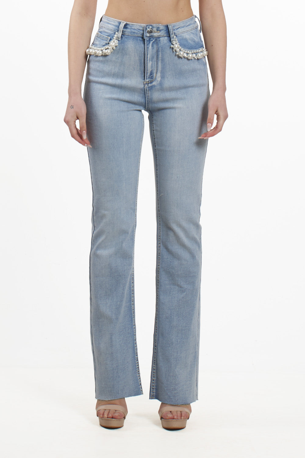 eans No Secrets che reinterpretano l'iconico denim con un tocco ultra-femminile e prezioso, caratterizzati da un lavaggio chiaro con leggere sfumature. Il modello si distingue per il taglio flare a zampa che slancia la figura, impreziosito da applicazioni di perle degradé sui profili delle tasche anteriori. Un capo dal forte impatto glamour che unisce l'attitudine casual del denim a dettagli ricercati, ideale per i look contemporanei della stagione primavera estate.