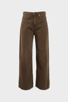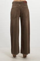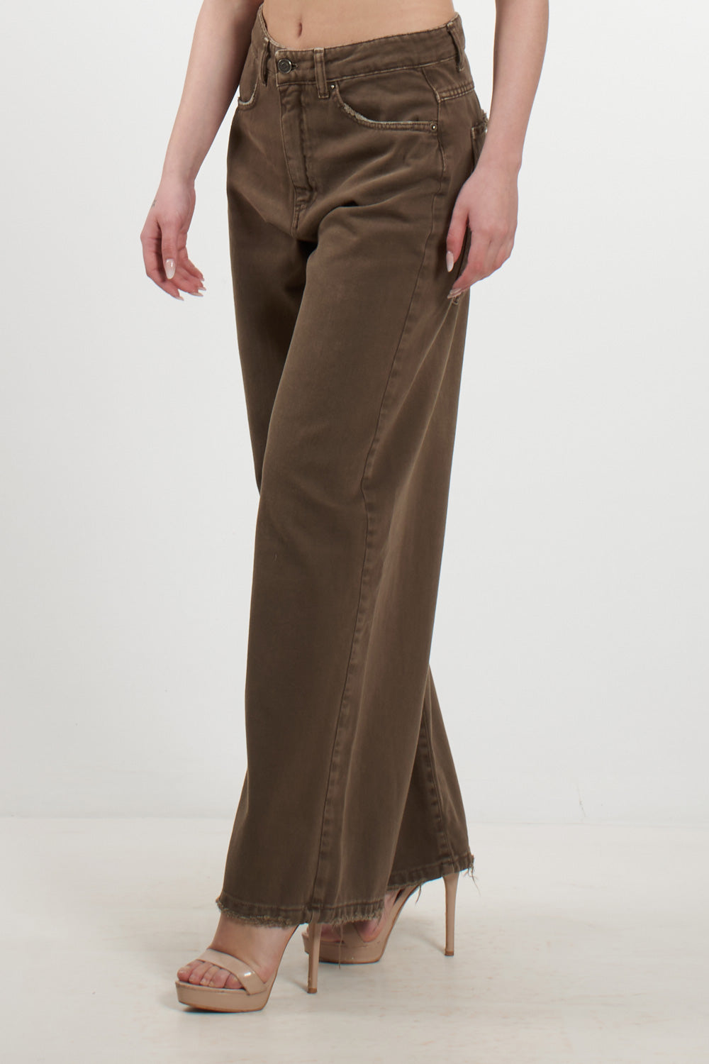 Pantalone in denim di Tensione In realizzato in 100% cotone, caratterizzato da un taglio contemporaneo a gamba ampia (wide leg). Il modello si distingue per la colorazione marrone fango dal finish lavato, che conferisce un aspetto vissuto ma ricercato. Presenta un orlo a taglio vivo leggermente sfrangiato, vita media con passanti e una silhouette fluida che garantisce comfort e stile per tutta la giornata.