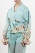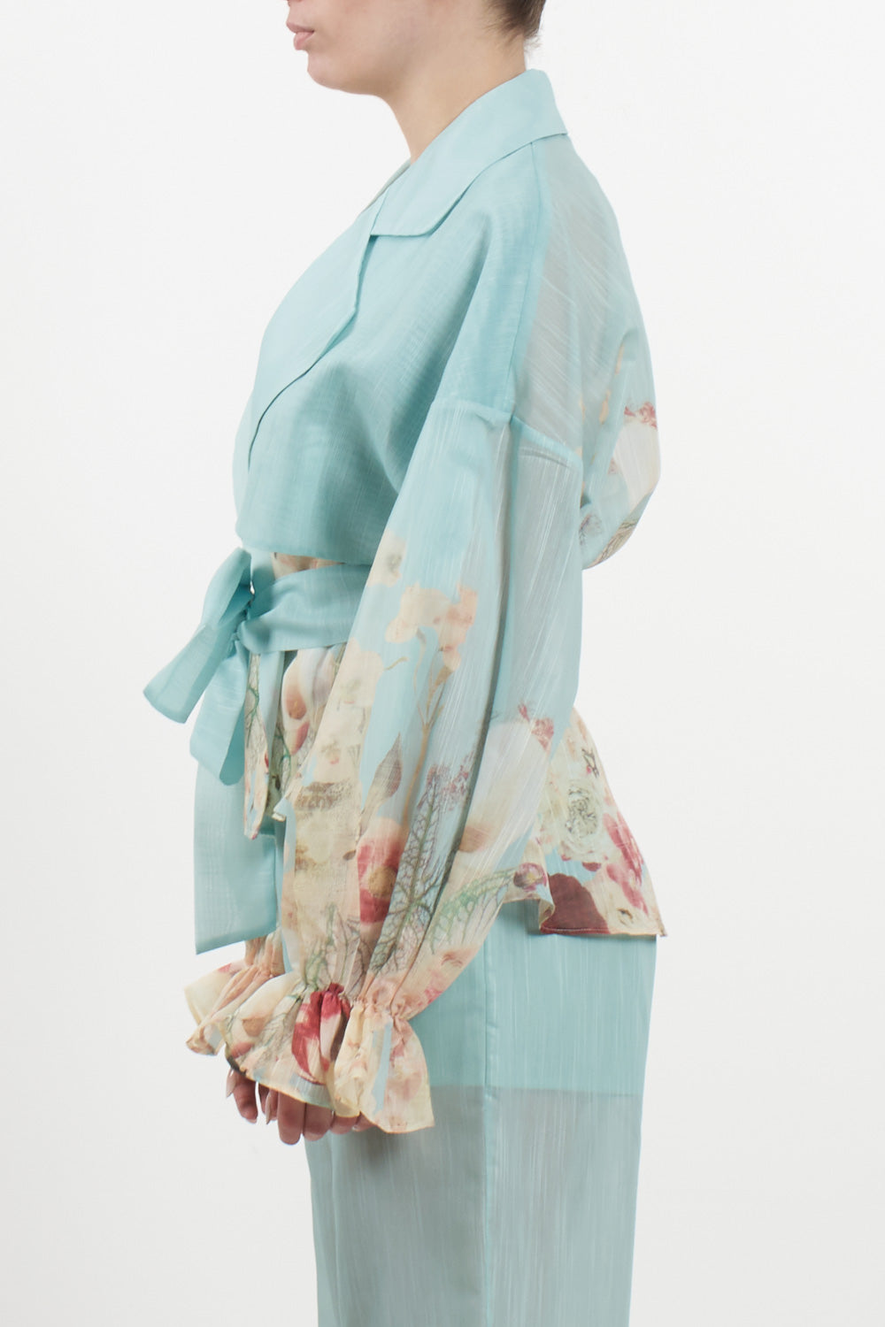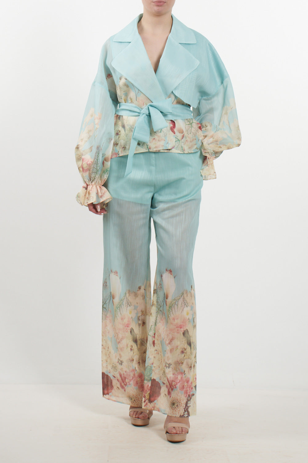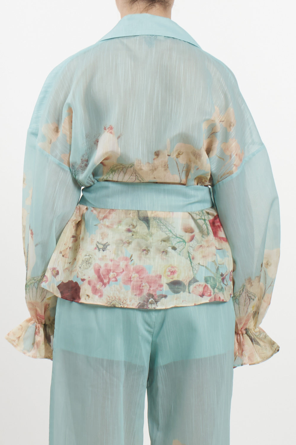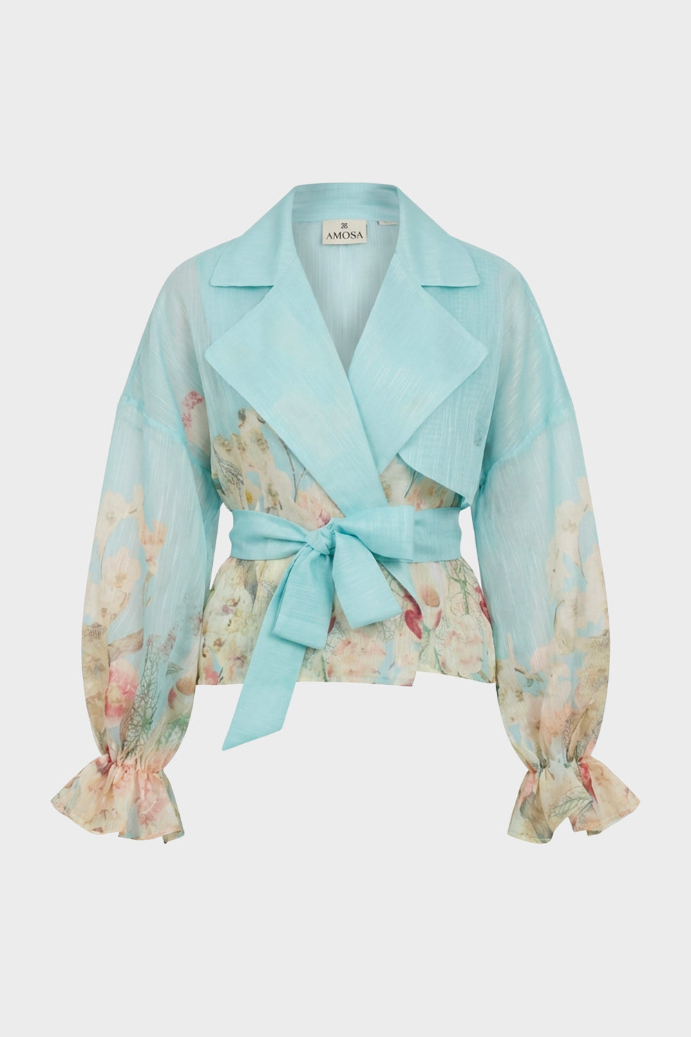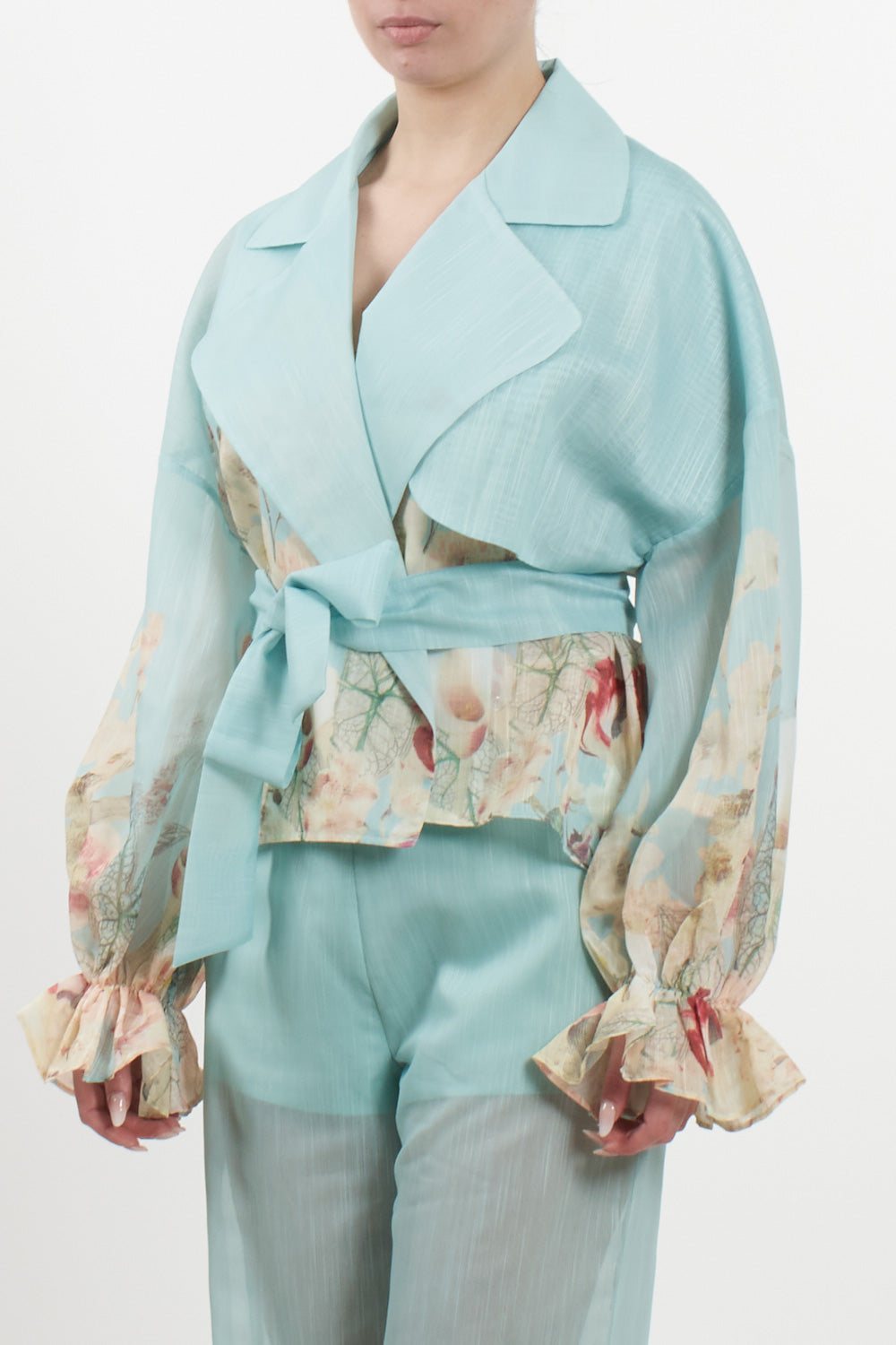 Giacca di Amosa caratterizzata da un design sofisticato e leggero, realizzata in un pregiato mix di 95% Nylon e 5% Seta. Il capo presenta una struttura a incrocio con chiusura frontale regolata da una cintura in tessuto coordinato, che permette di valorizzare il punto vita. Le maniche lunghe sono ampie e terminano con polsini arricciati, richiamando uno stile romantico e femminile. La giacca è impreziosita da una delicata stampa floreale nei toni dell'azzurro e del rosa su base acquamarina, che conferisce un aspetto etereo e primaverile. La texture semi-trasparente e luminosa del tessuto la rende perfetta sia come capospalla leggero che come elemento distintivo di un outfit elegante.