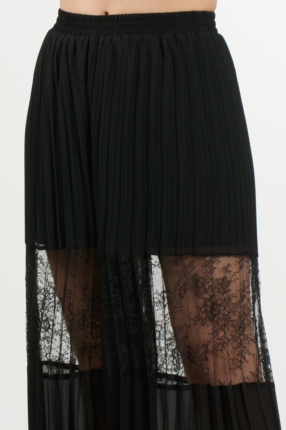 Questo pantalone palazzo è sensuale ma raffinato, grazie al gioco di trasparenze tra plissé e inserti in pizzo. Il taglio ampio dona fluidità ai movimenti, mentre l'elastico in vita garantisce una vestibilità confortevole.