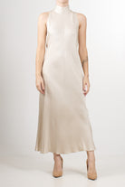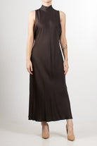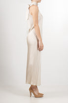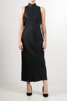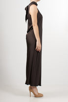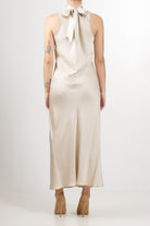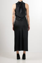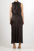 Abito lungo senza maniche in viscosa fluida, caratterizzato da collo alto con dettaglio fiocco annodato sul retro, linea pulita e leggermente svasata accompagna la silhouette con eleganza.