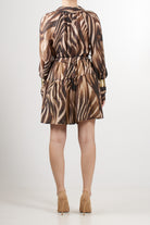 Abito corto di Motel modello chemisier con bottoni frontali e colletto classico. Realizzato in tessuto leggero con stampa animalier, presenta maniche lunghe con polsini decorati da bracciali removibili in finitura dorata e cintura sottile in vita per valorizzare la silhouette.