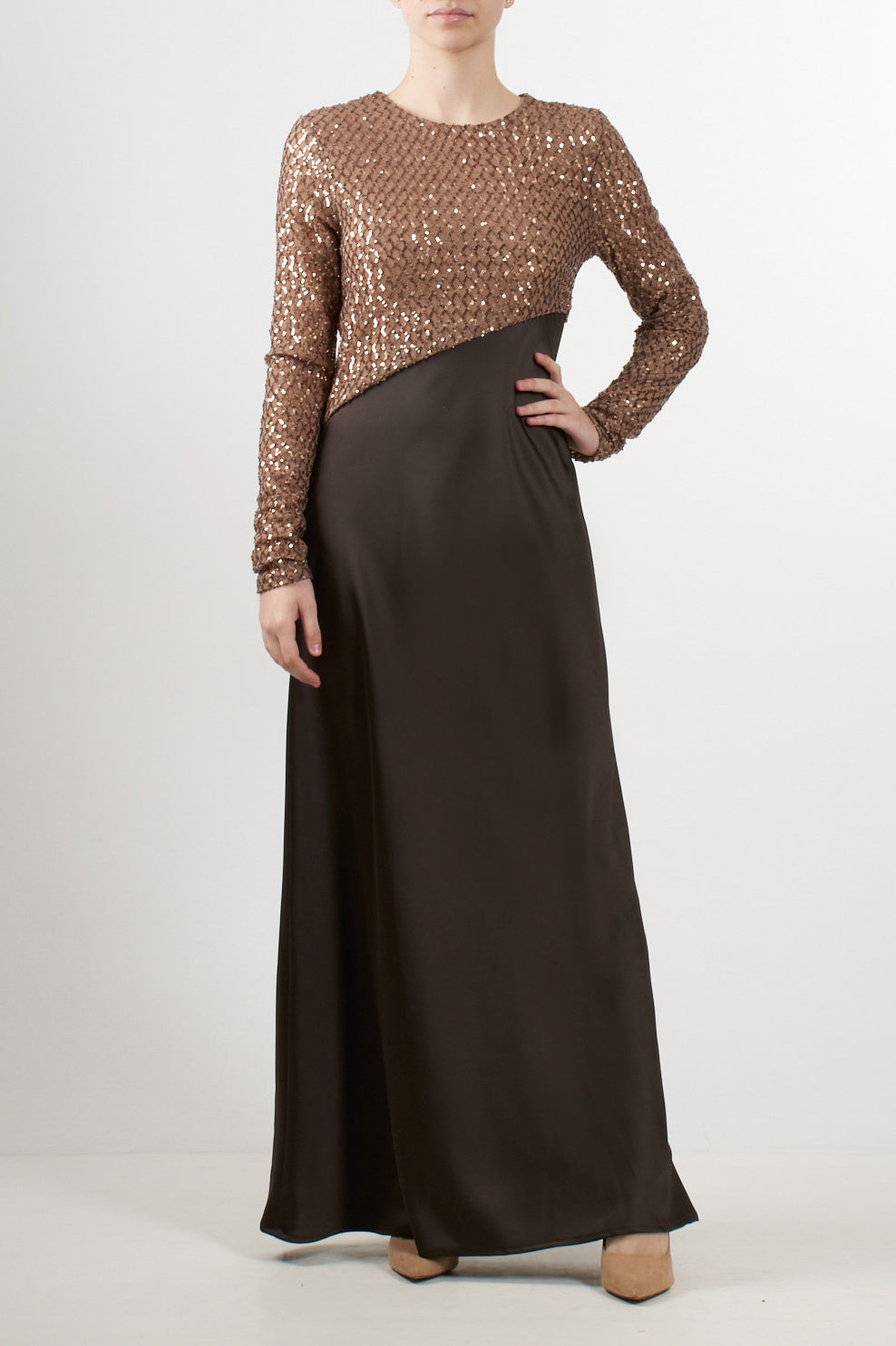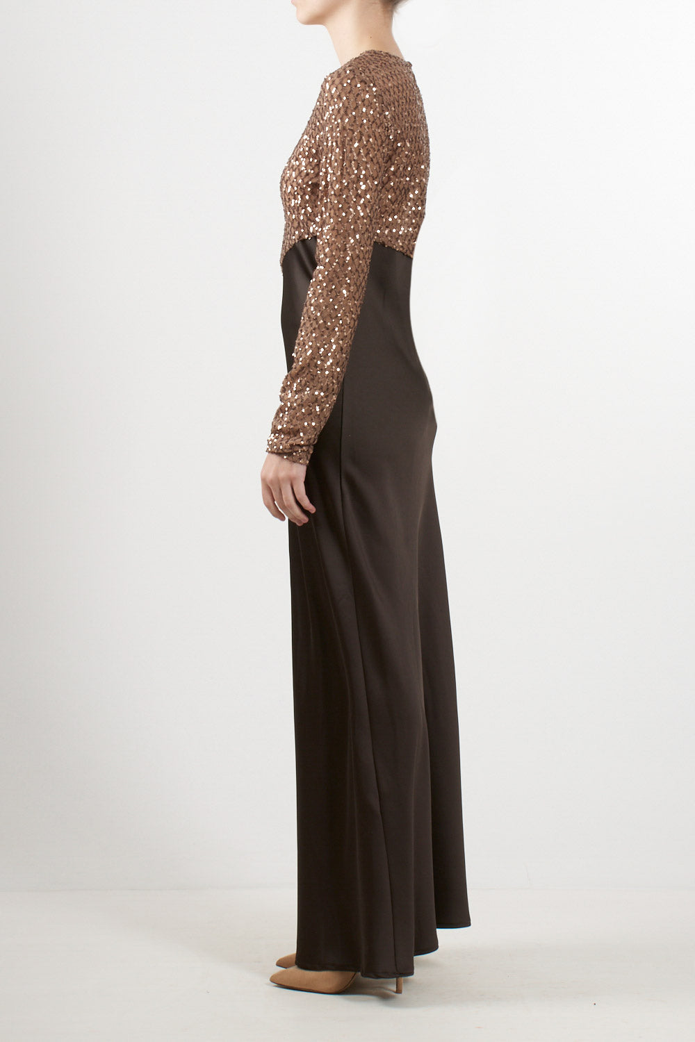 Abito elegante caratterizzato da un corpetto interamente ricoperto di paillettes color bronzo, con scollo tondo e maniche lunghe. Il top presenta un taglio diagonale che si unisce alla gonna lunga in tessuto liscio, creando un raffinato contrasto di texture. La linea è morbida e scivolata, perfetta per serate ed eventi speciali.