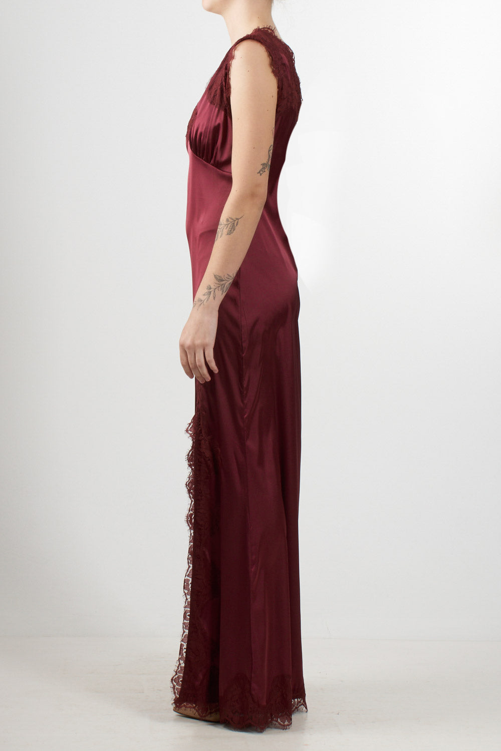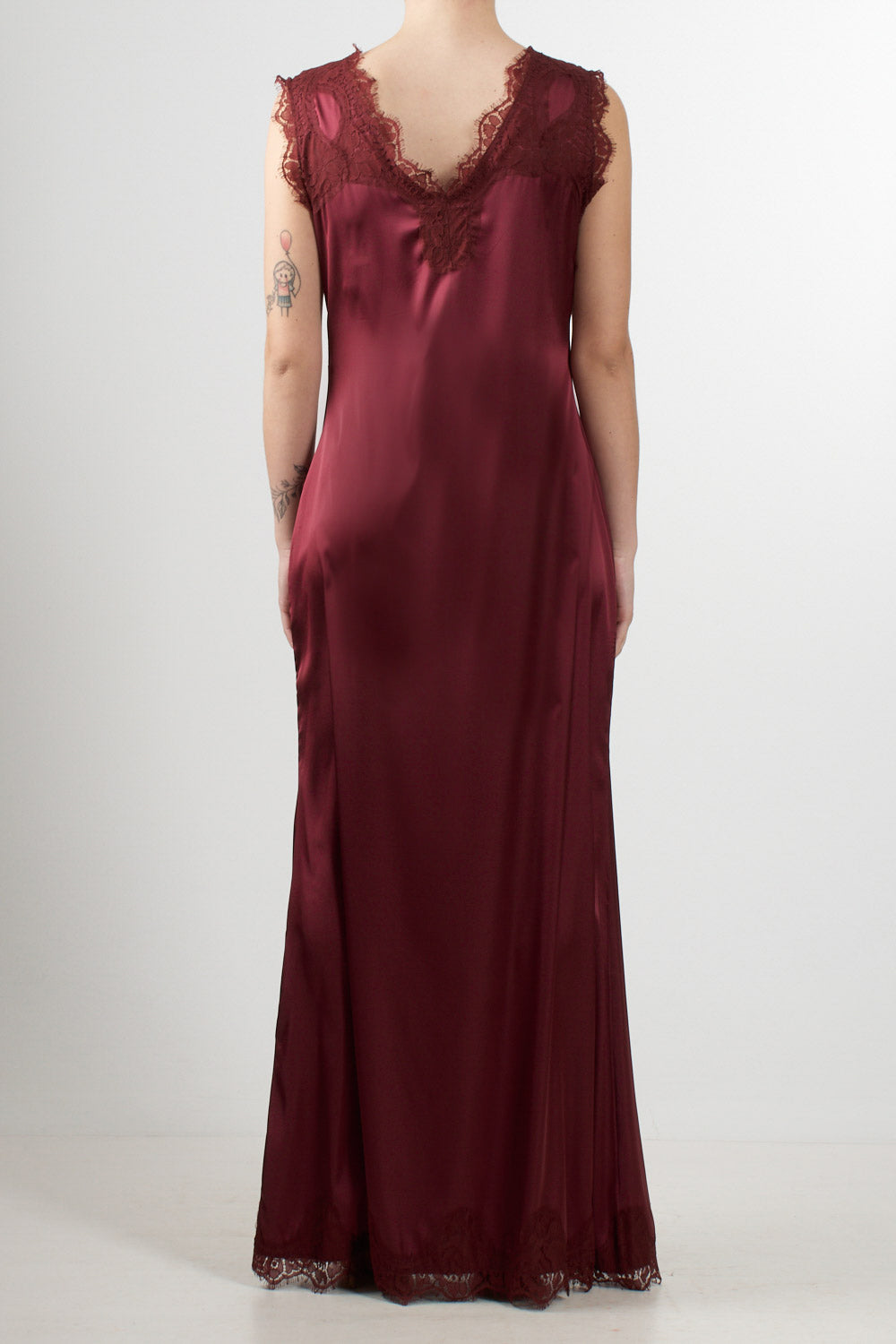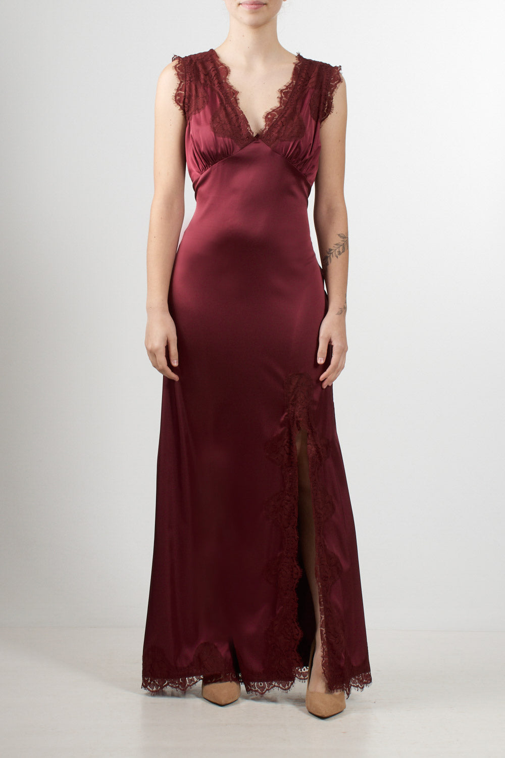 Elegante abito lungo firmato No Secrets, realizzato in morbido raso con dettagli in pizzo che valorizzano la scollatura e lo spacco frontale. Il modello presenta una linea fluida che avvolge delicatamente la figura, rendendolo ideale per eventi serali o cerimonie. La texture lucente del tessuto e le rifiniture in pizzo donano un tocco di sofisticata femminilità.