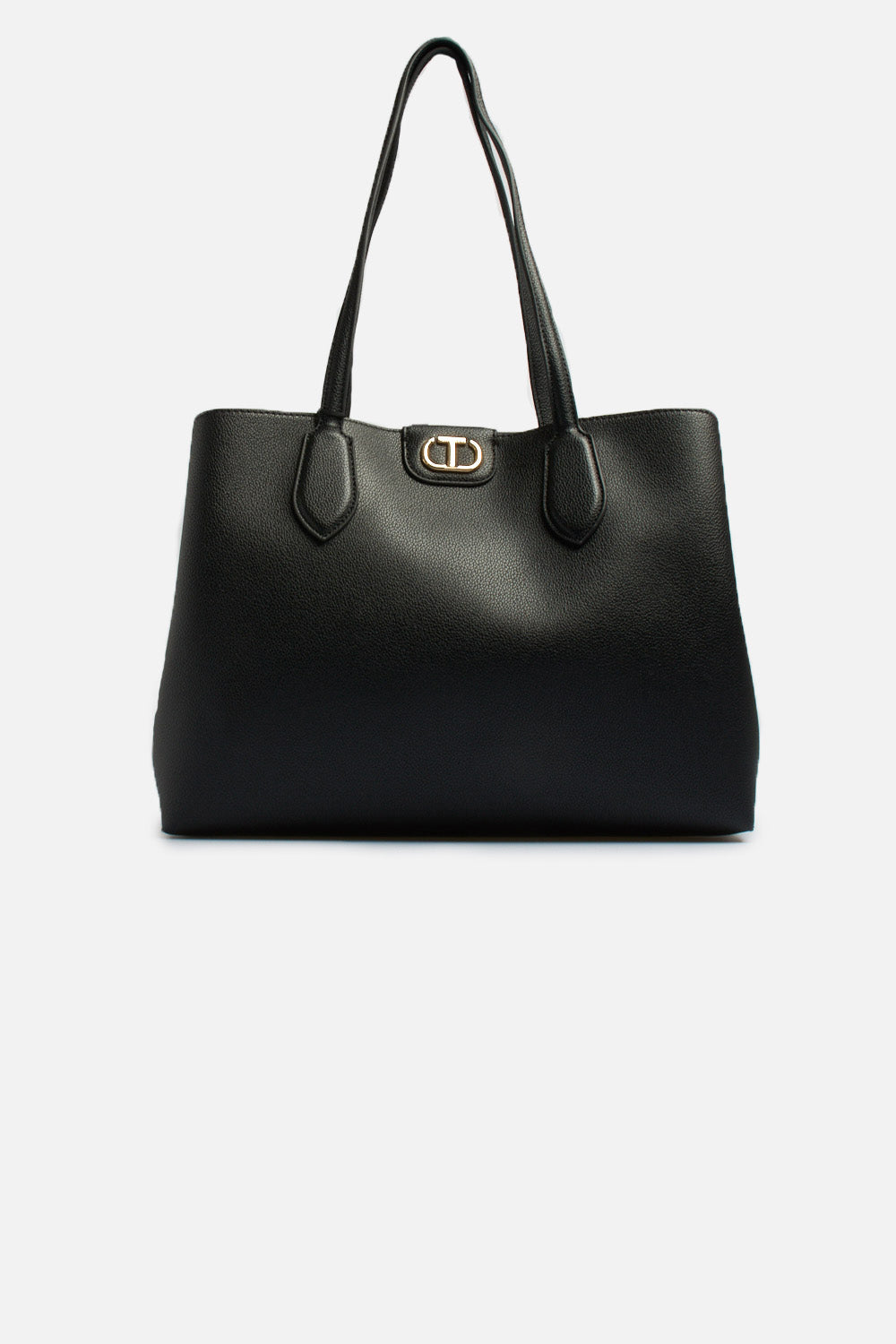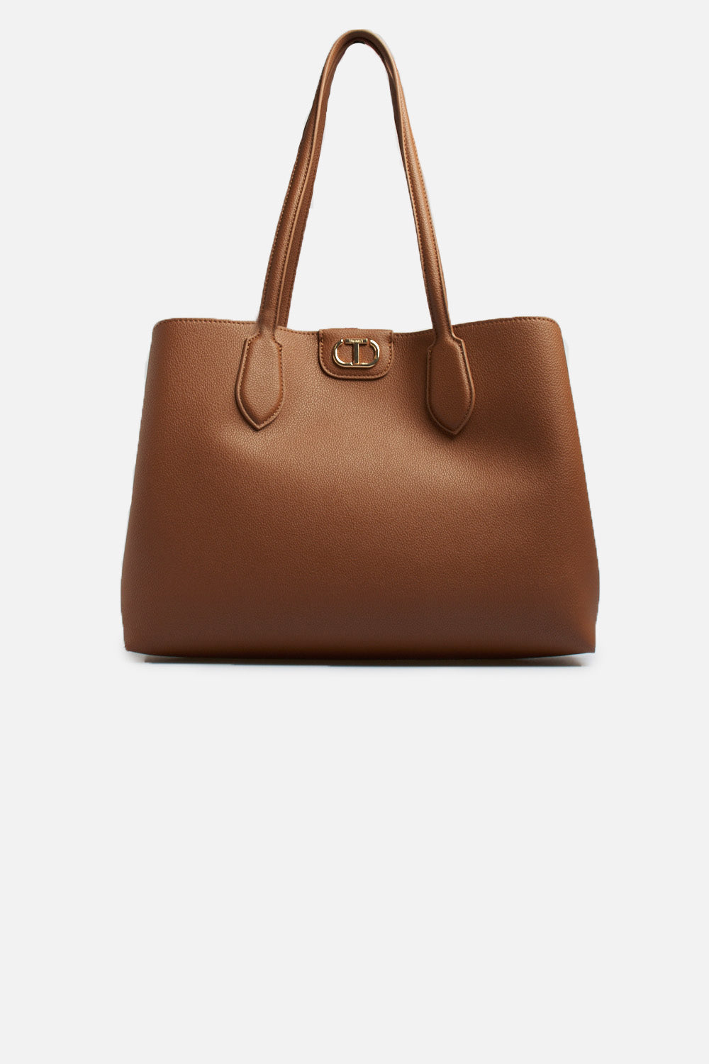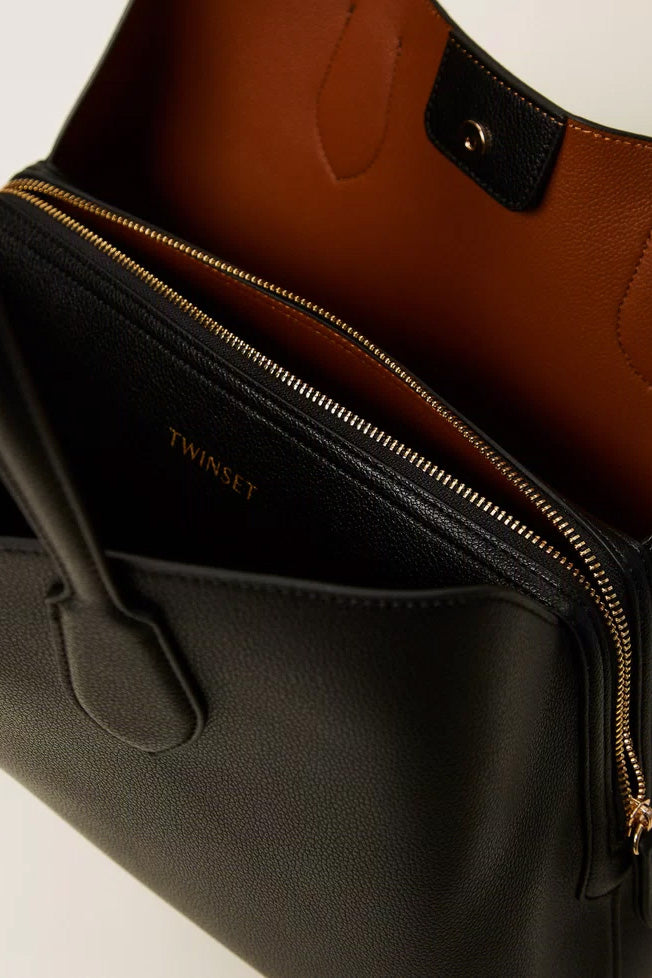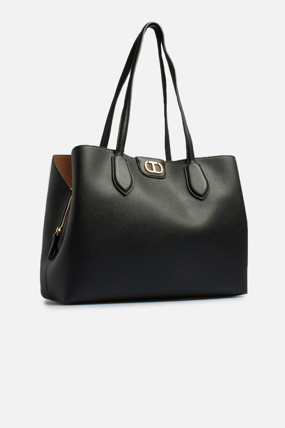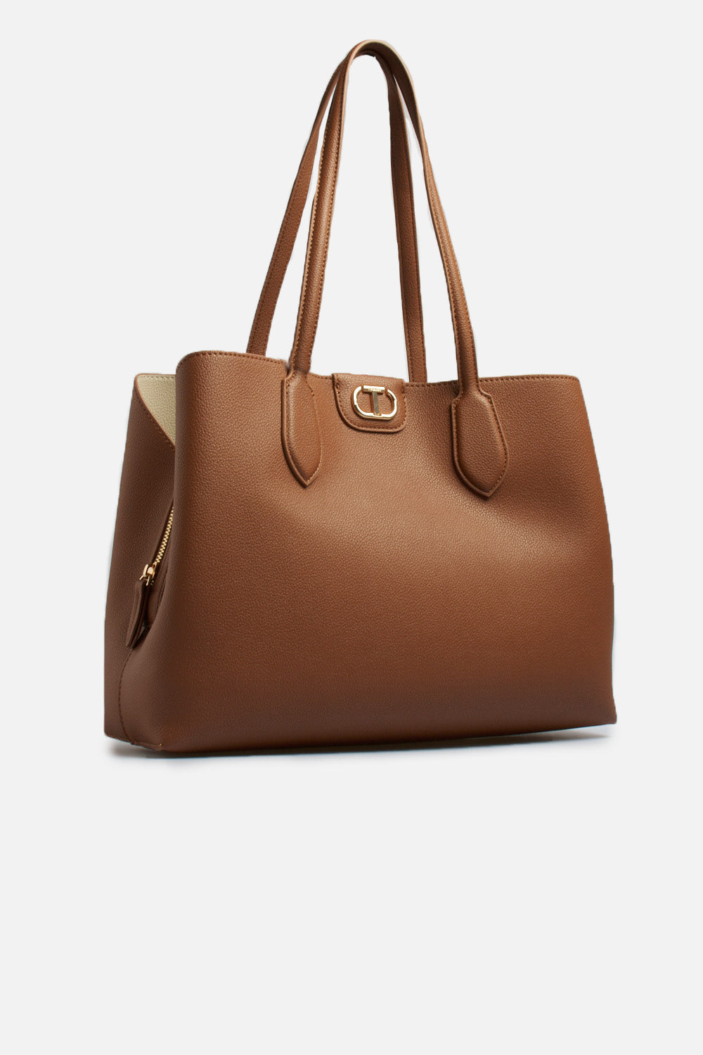 Borsa shopper di Twinset realizzata in materiale effetto pelle con grana naturale e interno a contrasto bicolore. Doppio manico a spalla, ampi vani interni laterali chiusi da magnete e un grande scomparto centrale con chiusura a zip. Logo Oval T in metallo dorato impreziosisce la parte frontale.