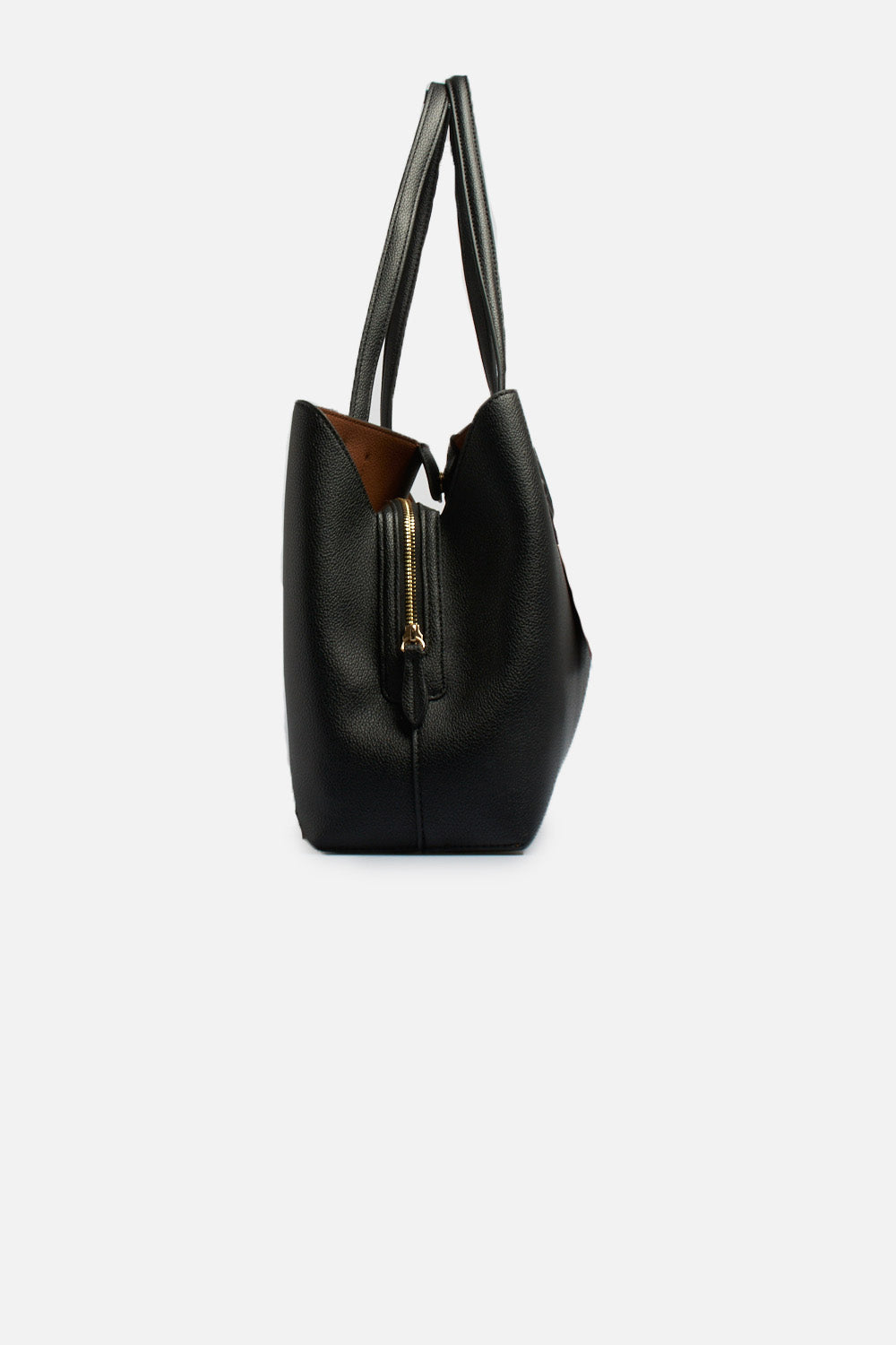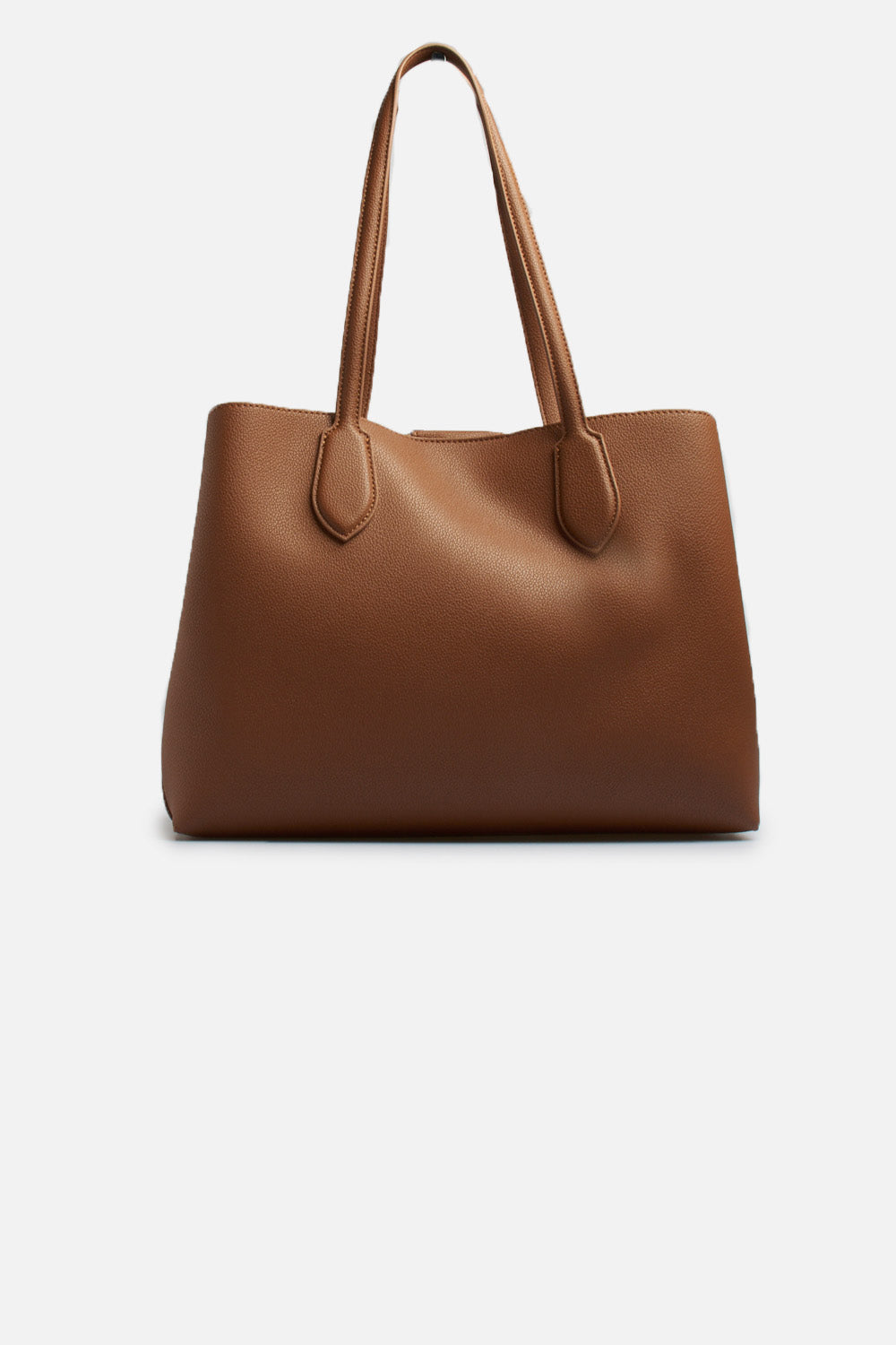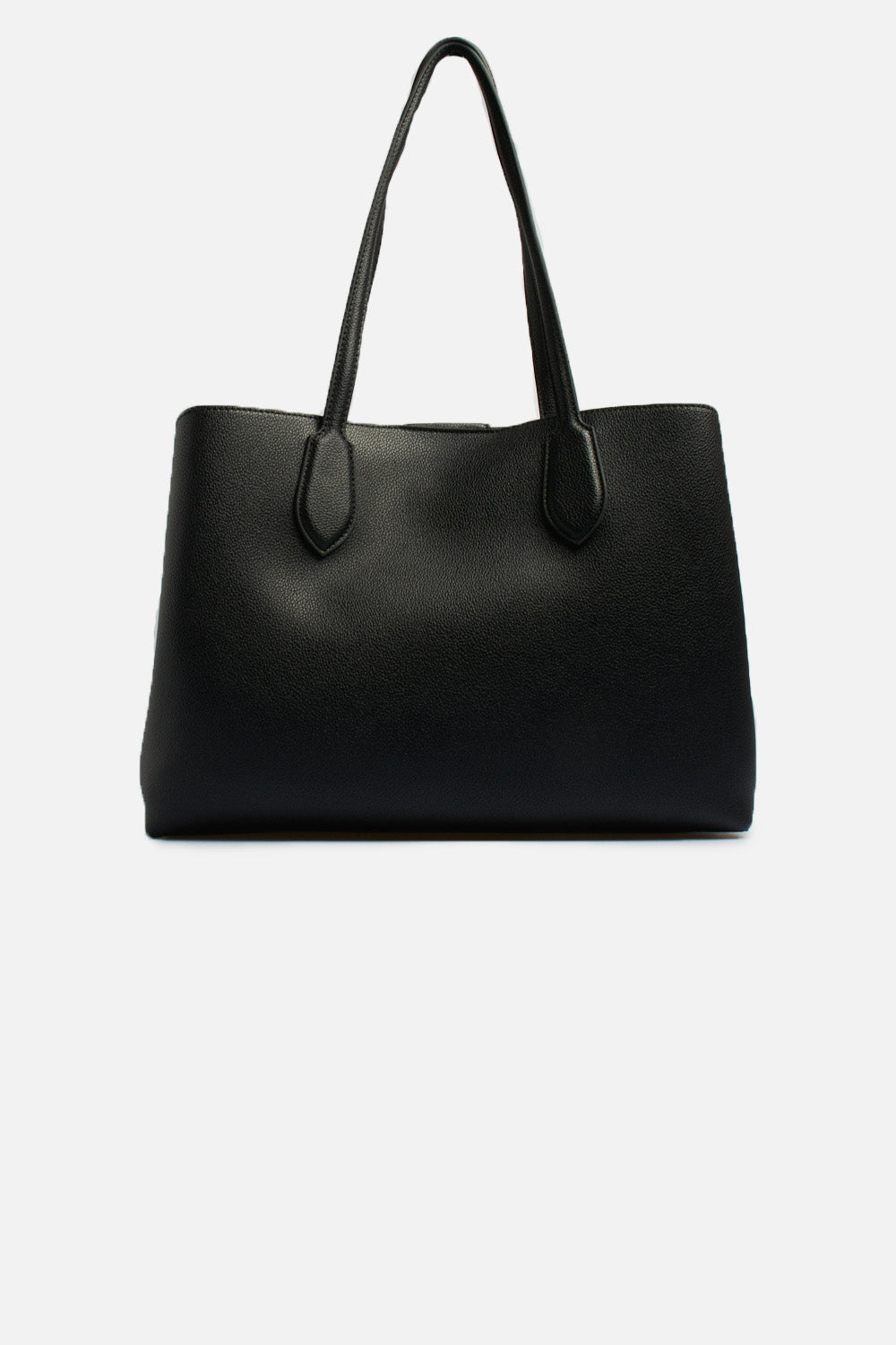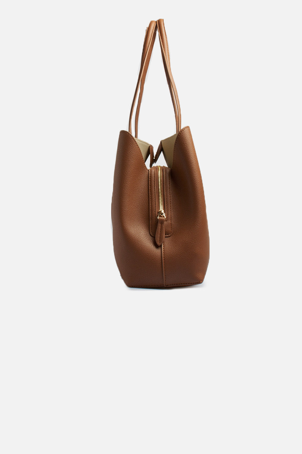 Borsa shopper di Twinset realizzata in materiale effetto pelle con grana naturale e interno a contrasto bicolore. Doppio manico a spalla, ampi vani interni laterali chiusi da magnete e un grande scomparto centrale con chiusura a zip. Logo Oval T in metallo dorato impreziosisce la parte frontale.